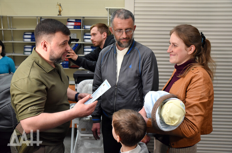 Мариуполь, 28 апр – корр. ДАН. Первое свидетельство республиканского образца о рождении ребенка было выдано сегодня в Мариуполе. Поздравить мариупольскую семью Щербак с рождением ребенка приехали Глава ДНР Денис Пушилин и министр юстиции Республики Юрий Сироватко.