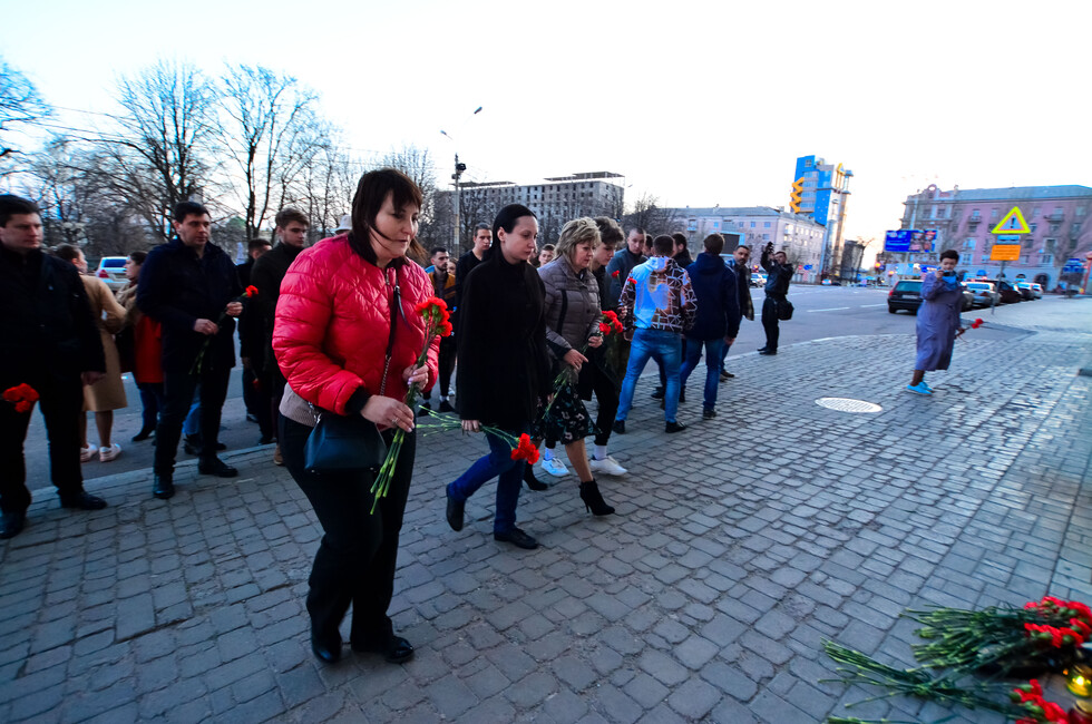 Жители собрались на пересечении улицы Артема и проспекта Богдана Хмельницкого возле здания, где сделан мурал с портретом Бузины. Пришло несколько десятков человек, в основном молодежь. Люди несли цветы и лампадки.