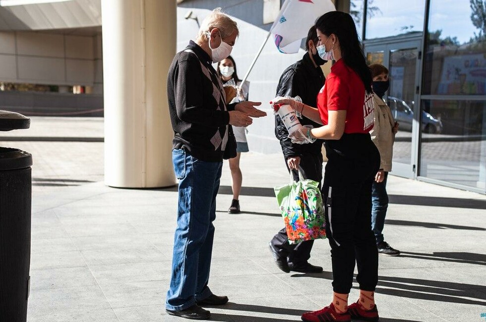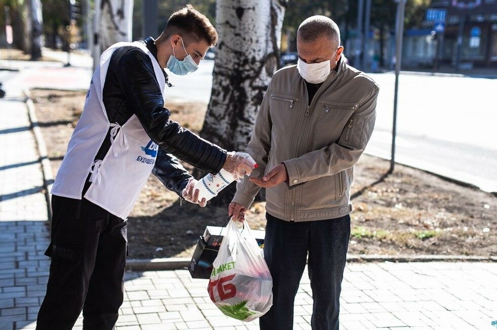 Волонтеры в течение дня обрабатывали руки прохожим дезинфицирующим средством с целью профилактики гриппа и коронавирусной инфекции в местах массового скопления людей – у торговых центров «Донецк Сити» и «Континент», на бульваре Пушкина, на Калининском и Крытом рынках и проспекте Богдана Хмельницкого.