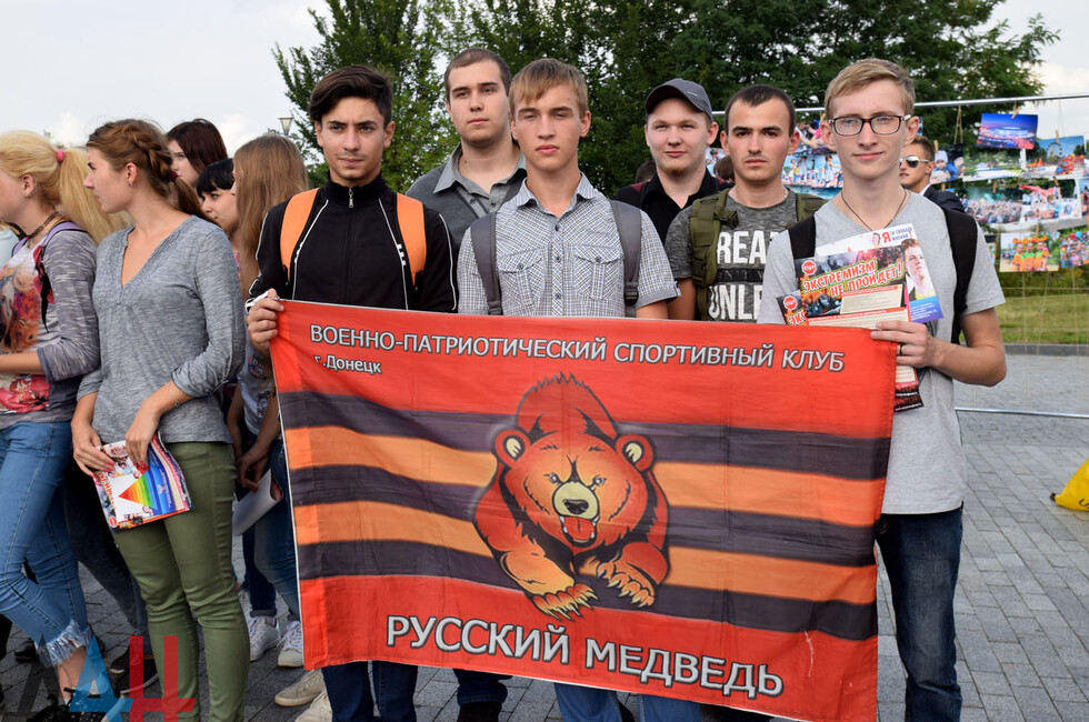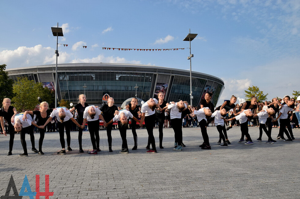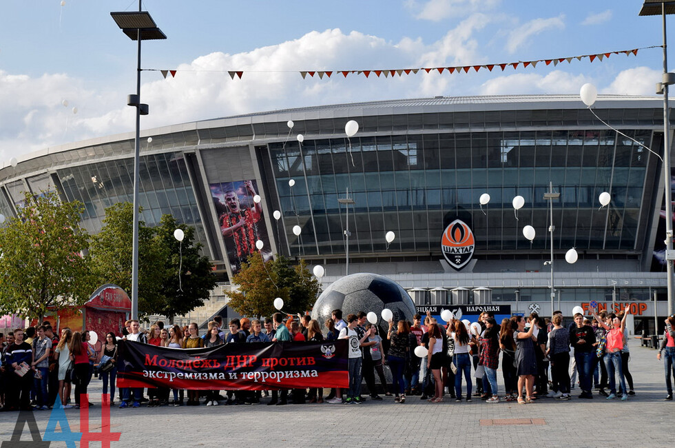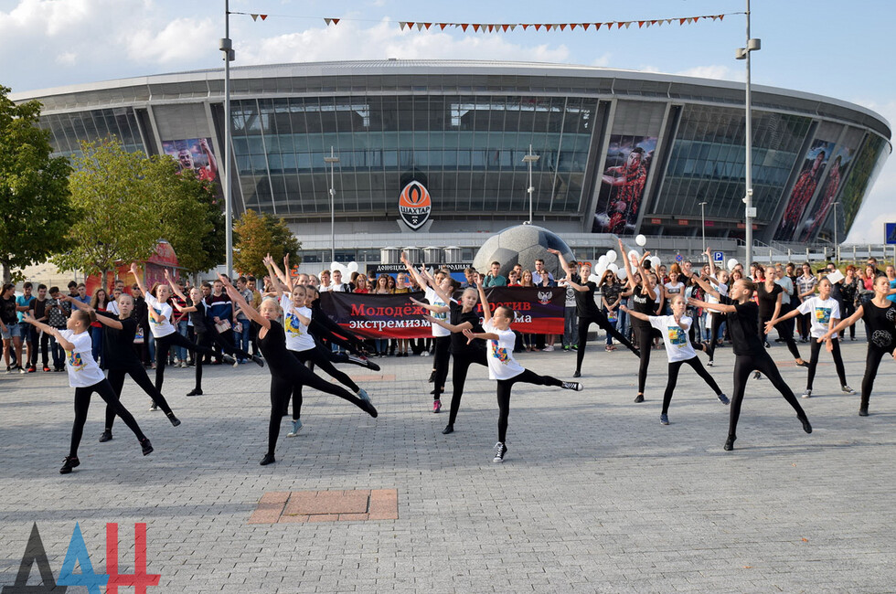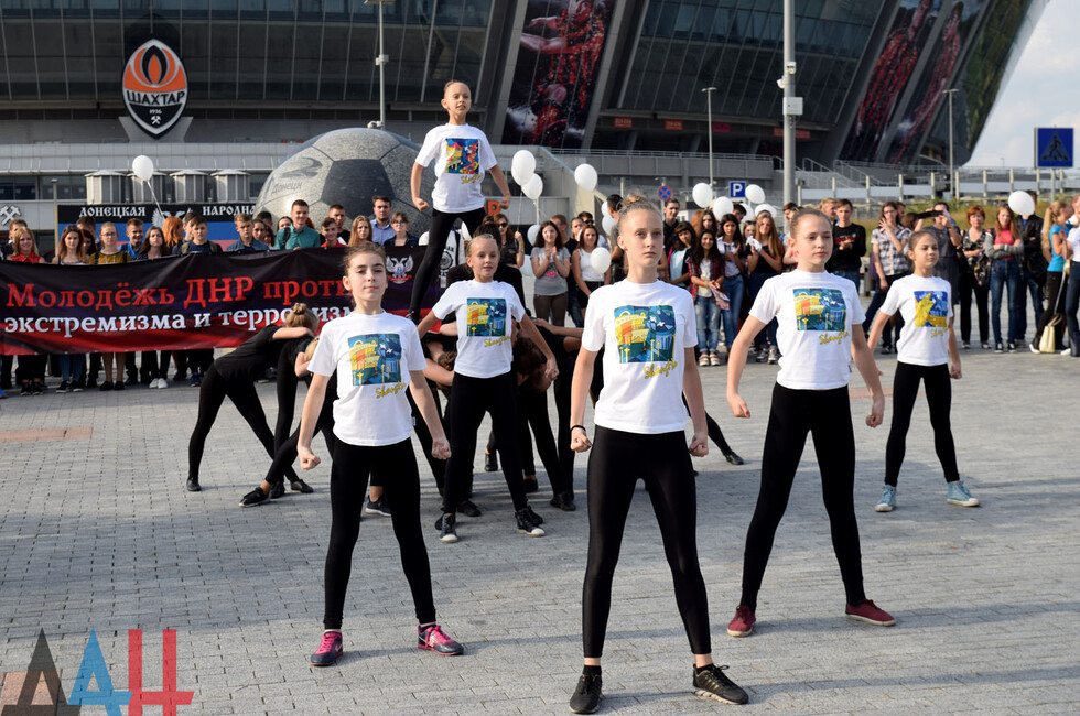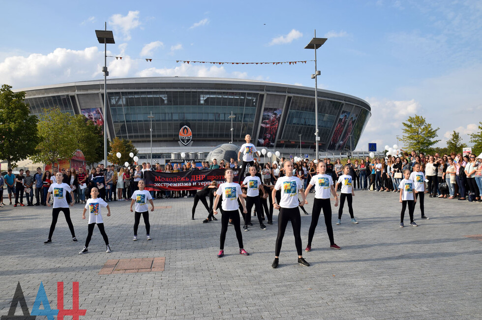 Донецк, 5 сен – корр. ДАН. Флешмоб «Республиканский марш солидарности», приуроченный ко Дню солидарности в борьбе с терроризмом, прошел сегодня возле донецкого стадиона «Донбасс Арена». В мероприятии приняли участие более 300 жителей из ДНР и около 30 с подконтрольной украинским властям территории Донецкой области.