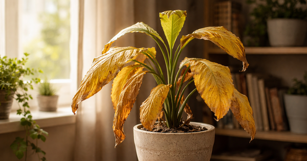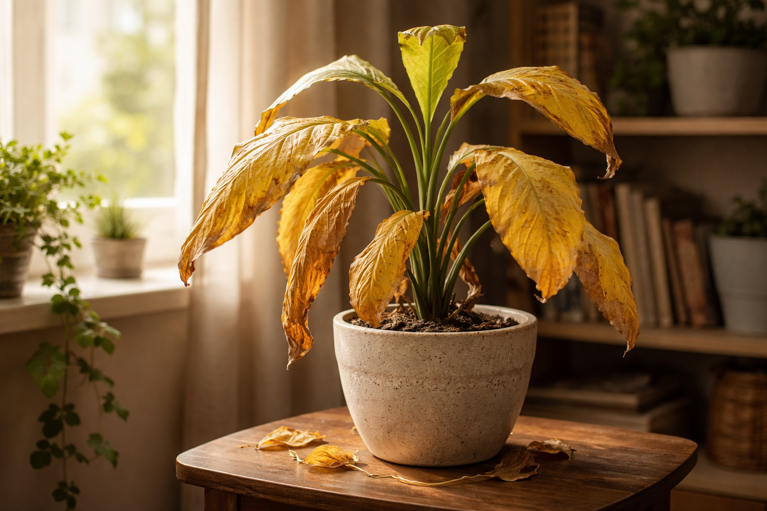 Если грунт долго остаётся мокрым — корням не хватает кислорода. Питание усваивается хуже, и листья начинают желтеть равномерно, чаще снизу. При запущенной ситуации появляются вялость и запах сырости из горшка. Решение — сократить полив, дать субстрату полностью просохнуть. При гнили корней спасти растение уже могут только пересадка с обрезкой повреждённых корней и более рыхлая почва.