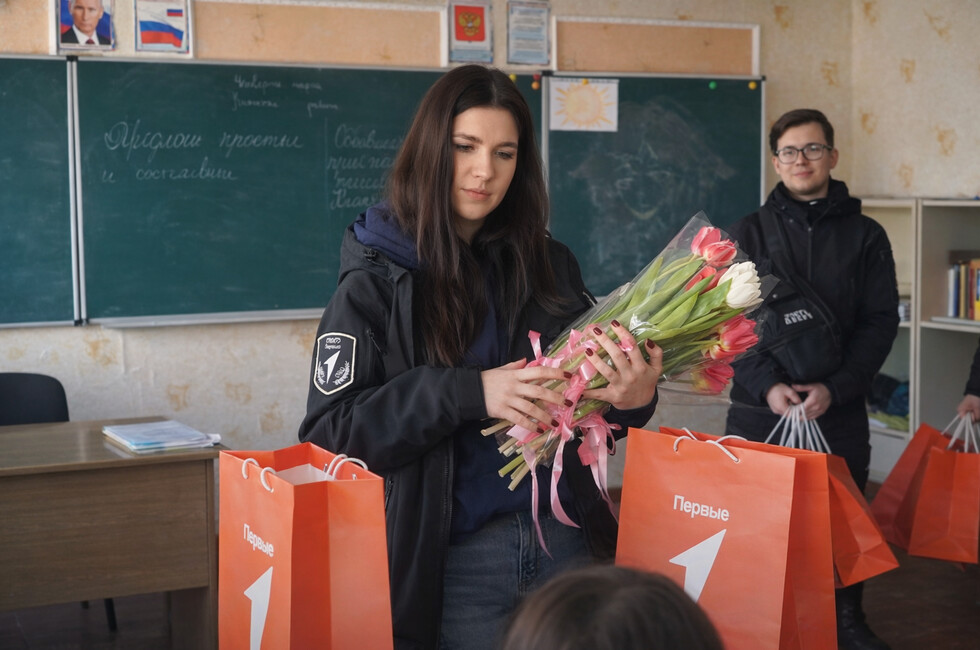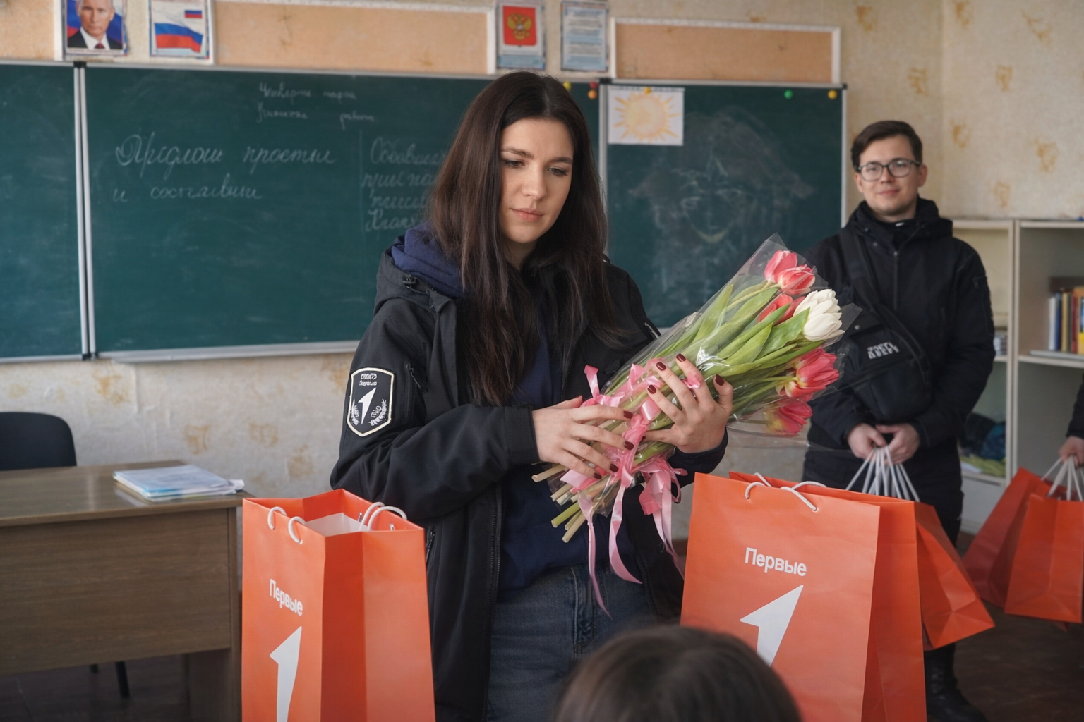 Активисты привезли в населенные пункты 100 наборов гуманитарной помощи и лично поздравили женщин. Председатель «Движения Первых» Александра Кульгина вручила цветы и подарки 30 педагогам и ученицам.