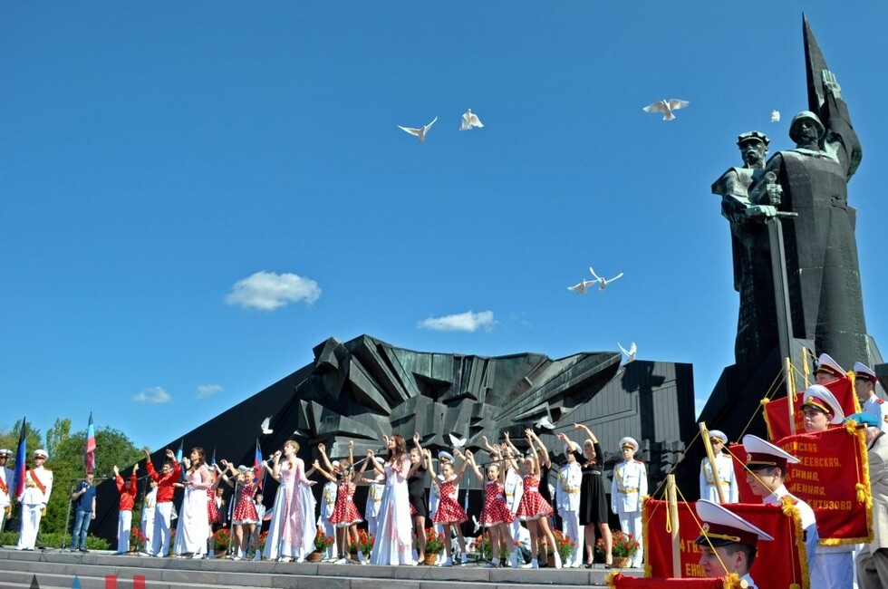 Память погибших за освобождение Донбасса присутствующие почтили минутой молчания и возложили цветы к монументу. После этого для ветеранов творческие коллективы исполнили песни и стихи о войне. В конце концерта в небо запустили белых голубей, как символ мира.