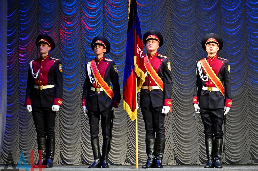 Церемония началась с показа фильма о работе полиции. Ролик длительностью около 20 минут представляет собой нарезку видеофрагментов о службе подразделений. После трансляции курсанты академии МВД торжественно вынесли на сцену флаги ДНР и министерства, заиграл гимн Республики.
