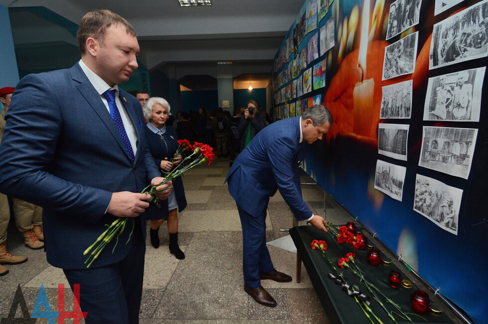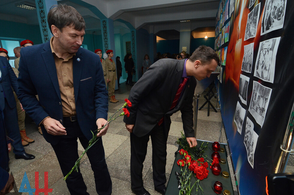 В холле учреждения была организована выставка рисунков школьников Донецка с призывами к миру на Земле. Также рядом с «Вечным огнем» располагался баннер с фотографиями жертв преступлений нацисткой Германии.