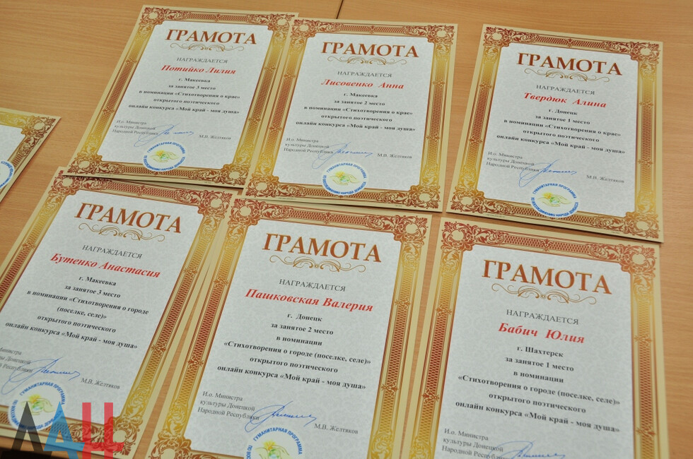Донецк, 16 дек – ДАН. Результаты республиканского поэтического конкурса «Мой край – моя душа» были озвучены сегодня в Донецке. Среди победителей и призеров девять жителей ДНР и столько же с подконтрольной украинским властям территории.
