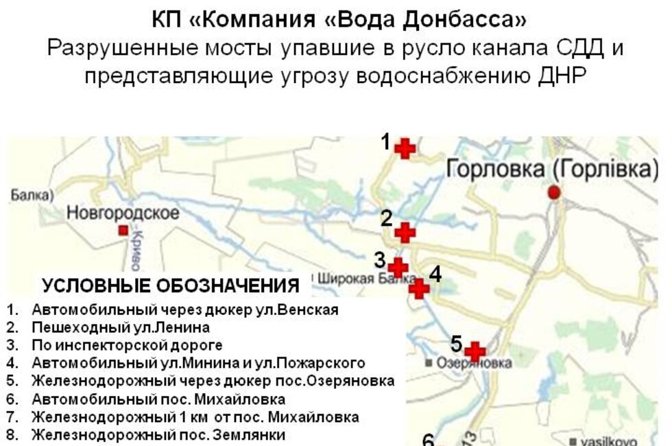 По данным источника, предложения Донецка включают отрезок трубопровода канала «Северский Донец – Донбасс» (далее СДД) от поселка Майорск – балка Шумы до поселка Мичурино в Горловке, линии электропередач (110 кВ) в пригороде города Горловка и ЛЭП на нейтральной территории в районе Докучаевска, а также три обрушенных из-за военных действий в русло канала Северский Донец моста. «Данные мосты создают препятствия на пути движения воды в канале СДД и представляют угрозу прекращения подачи воды по каналу в зимний период, требуется демонтаж», - добавил собеседник агентства.