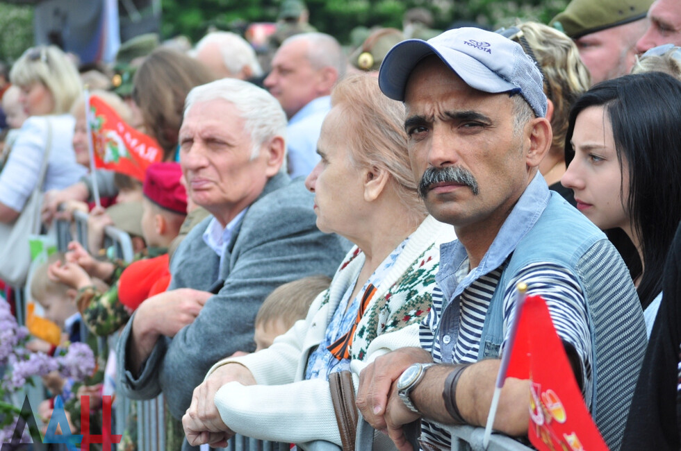 На площади в День Победы присутствовали жители из разных городов Донбасса, в том числе временно подконтрольных украинским властям районов. На праздник пришли люди разных возрастов и профессий. Многие по окончании военного марша присоединились к шествию Бессмертного полка. Среди участников было много детей.