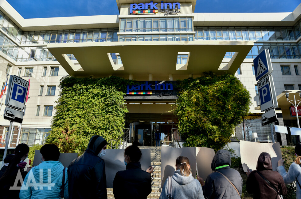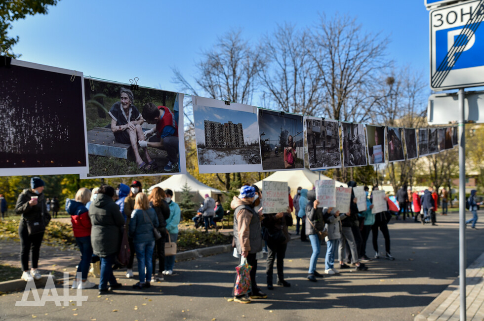 Также протестующие разместили перед парадным входом в гостиницу фотографии, на которых запечатлены последствия преступлений украинских войск в Донбассе. По словам собеседника, мероприятие носит стихийный характер. В нем участвуют люди разных возрастов и профессий. Акция проходит с соблюдением противоэпидемических мер.