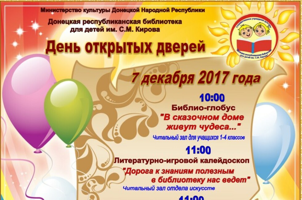 «В Донецке 7-8 декабря 2017 года состоятся мероприятия, посвященные 85-летию Донецкой республиканской библиотеки для детей им. Кирова, основанной в 1932 году, – отметили в пресс-службе. – Коллектив библиотеки приглашает жителей Республики, а также с территории Донецкой области, временно подконтрольной Украине, посетить праздничные мероприятия».