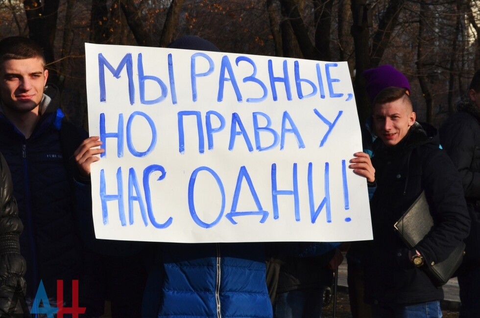 Манифестанты собрались перед гостиницей, где базируется офис наблюдательной миссии ОБСЕ. Они принесли с собой плакаты с надписями «Мы разные, но права у нас одни», «Голос ДНР имеет значение» и прочие. Митингующие призывали мировую общественность соблюдать их права в соответствии с декларацией ООН 1948 года.
