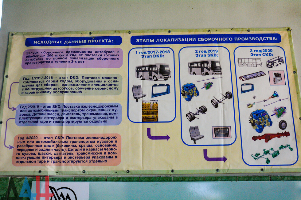 «По поручению министерства промышленности и торговли ДНР мы на заводе основали цех по сборке автобусов. Здесь в месяц мы можем собирать порядка 15 машин. На сегодняшний день это оптимальный транспорт по экономическим, техническим показателям и дизайну», - сказал журналистам директор завода Александр Швечиков.