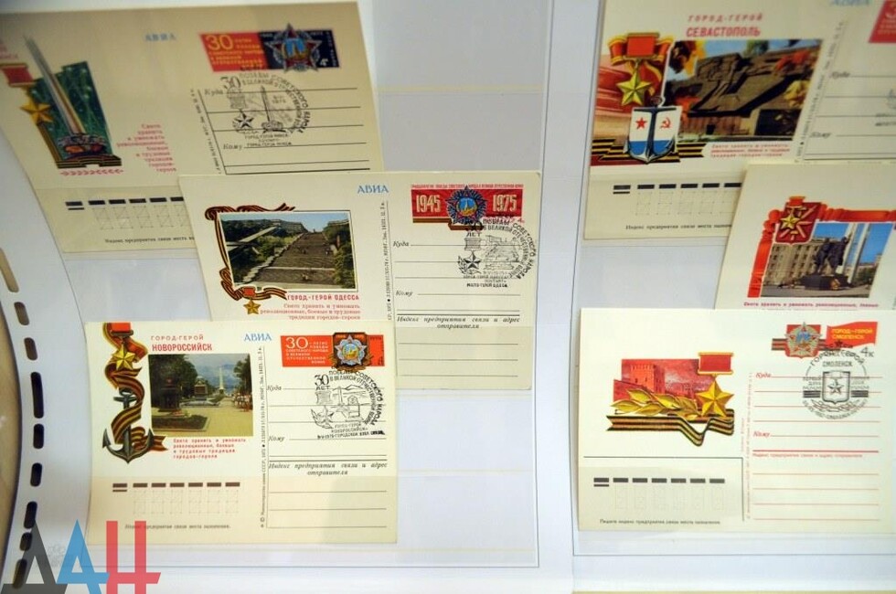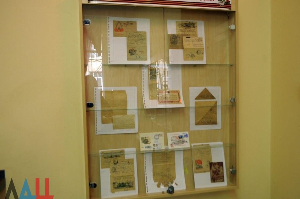 «На выставке, посвященной Великой Отечественной войне, представлены экспонаты разных лет, начиная с 1941 года и по сегодняшний день. Здесь посетитель сможет увидеть уникальные фронтовые письма, а также почтовую продукцию ДНР, России, Белоруссии, Украины, посвященную Дню Победы», – рассказал журналистам Захаров.