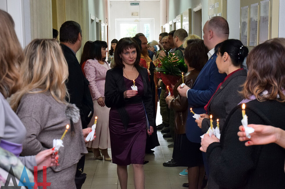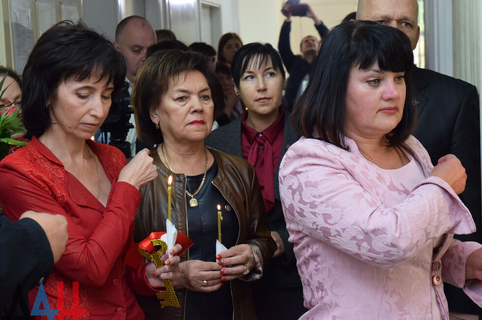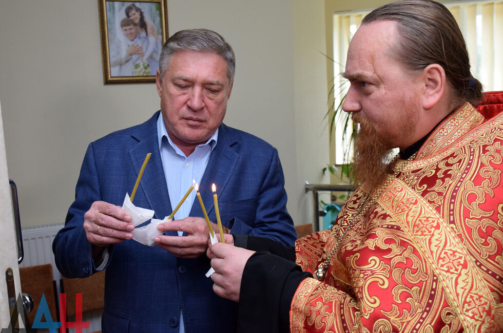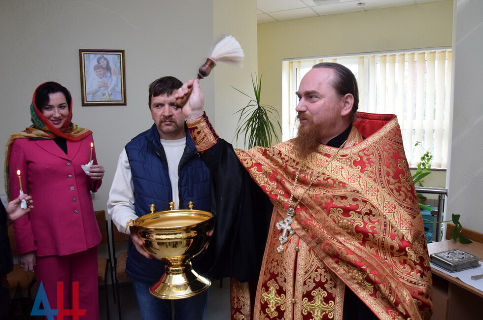 По окончанию торжественной части состоялось освящение здания. Обряд провел протоиерей, настоятель Свято-Вознесенского храма Донецка Сергей Еременко. После работники ЗАГСа получили от Минюста ДНР оргтехнику. Гость из Луганска в свою очередь преподнес коллегам символ бракосочетания в виде обручальных колец.