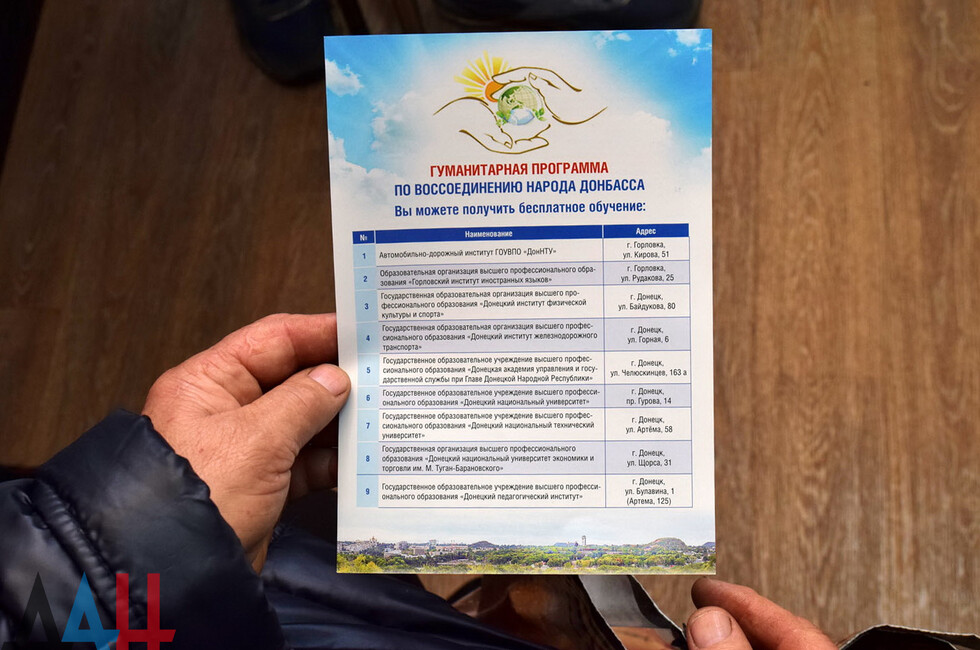 Напомним, что 17 февраля 2017 года Главы ДНР и ЛНР Александр Захарченко и Игорь Плотницкий утвердили гуманитарную программу по воссоединению народа Донбасса. Она включает оказание медицинской и финансовой помощи, создание квот для получения высшего и средне-специального образования, спортивные мероприятия, а также мероприятия по сохранению духовных и культурных ценностей, в которых могут принять участие жители временно подконтрольной Киеву территории. *нм*дя