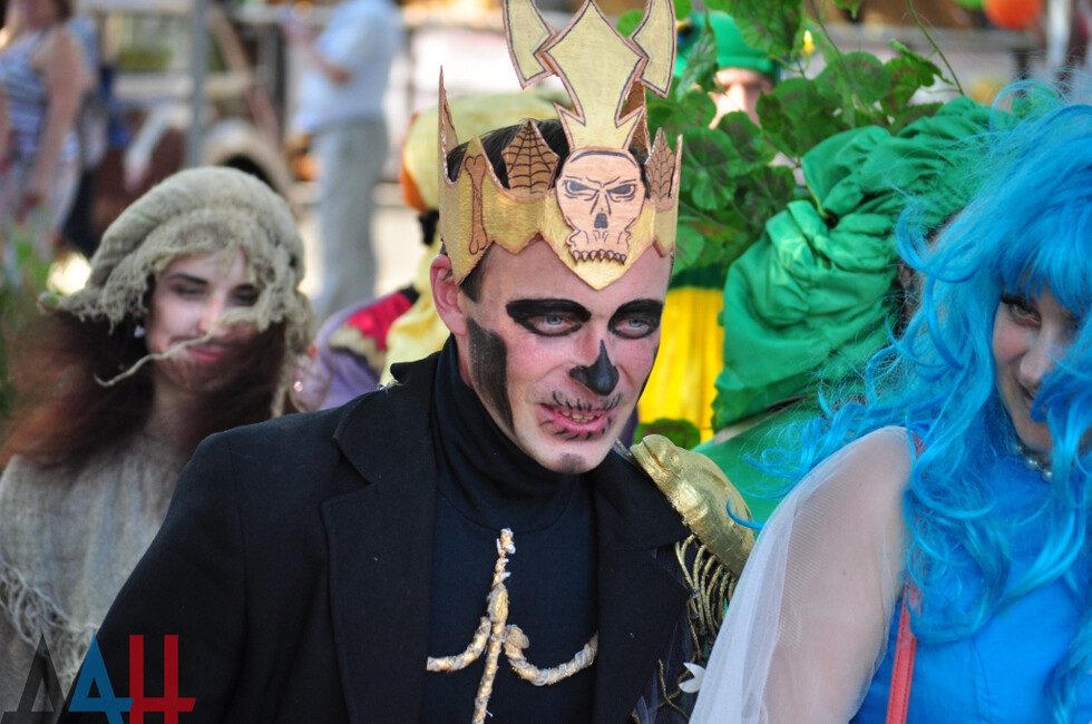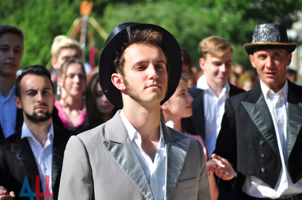 Участники прошли по центру Донецка от Дома Правительства к памятнику Пушкину. Они были одеты в костюмы пушкинских персонажей.