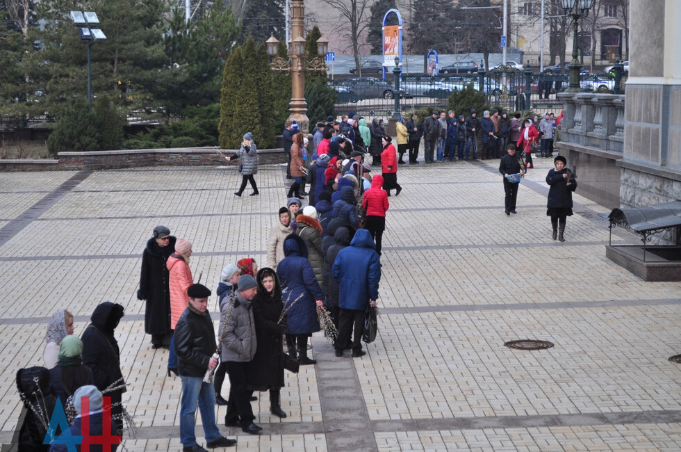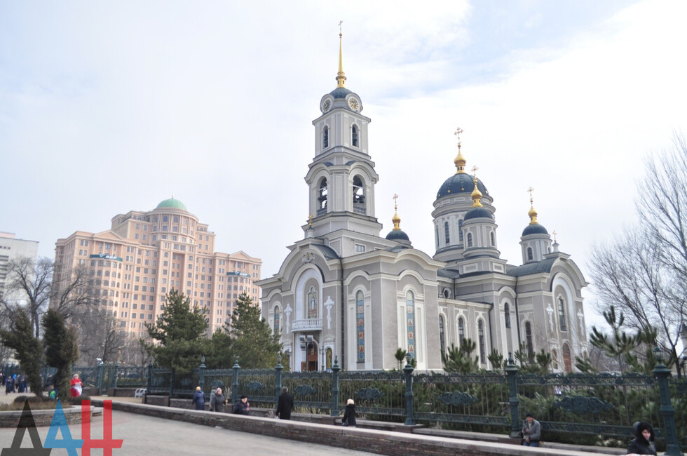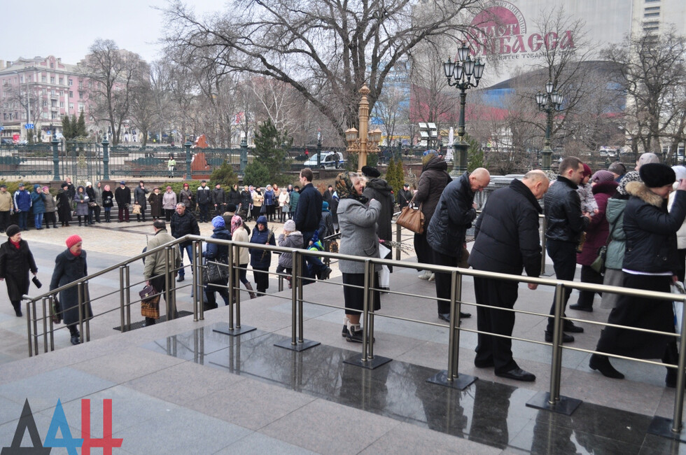 В Свято-Преображенском кафедральном соборе Донецка с утра собрались несколько тысяч человек. Среди них как гражданские, так и военнослужащие вооруженных сил Республики. Многие пришли семьями.