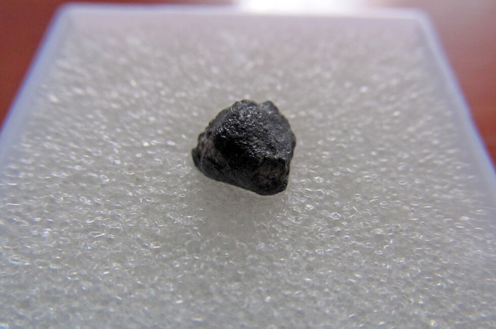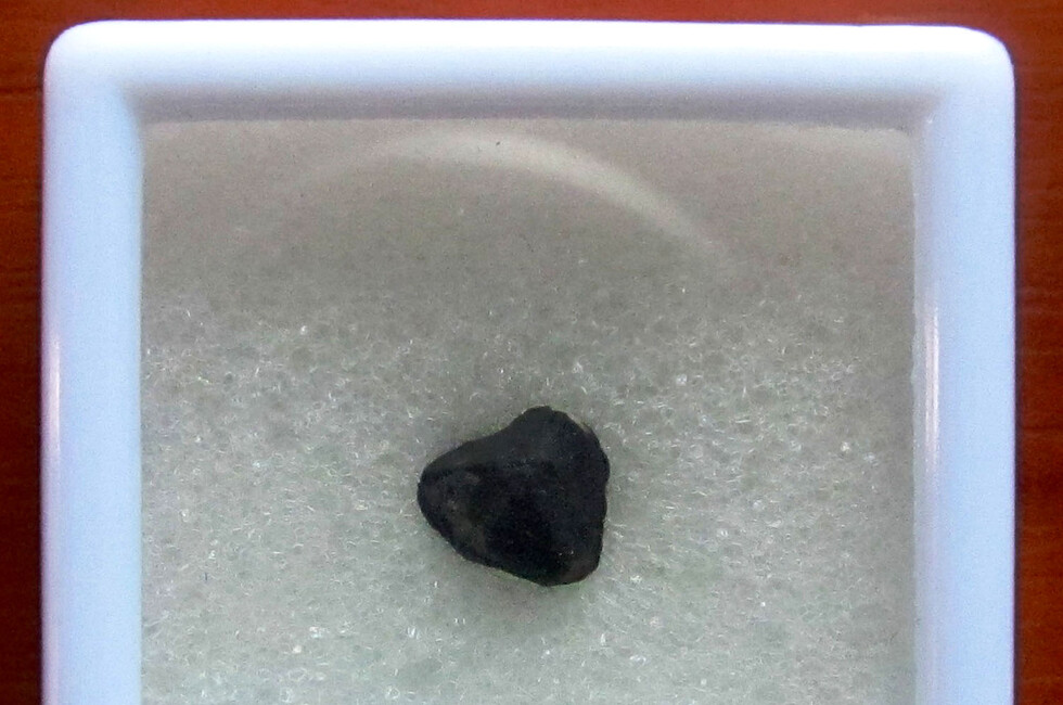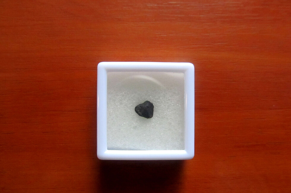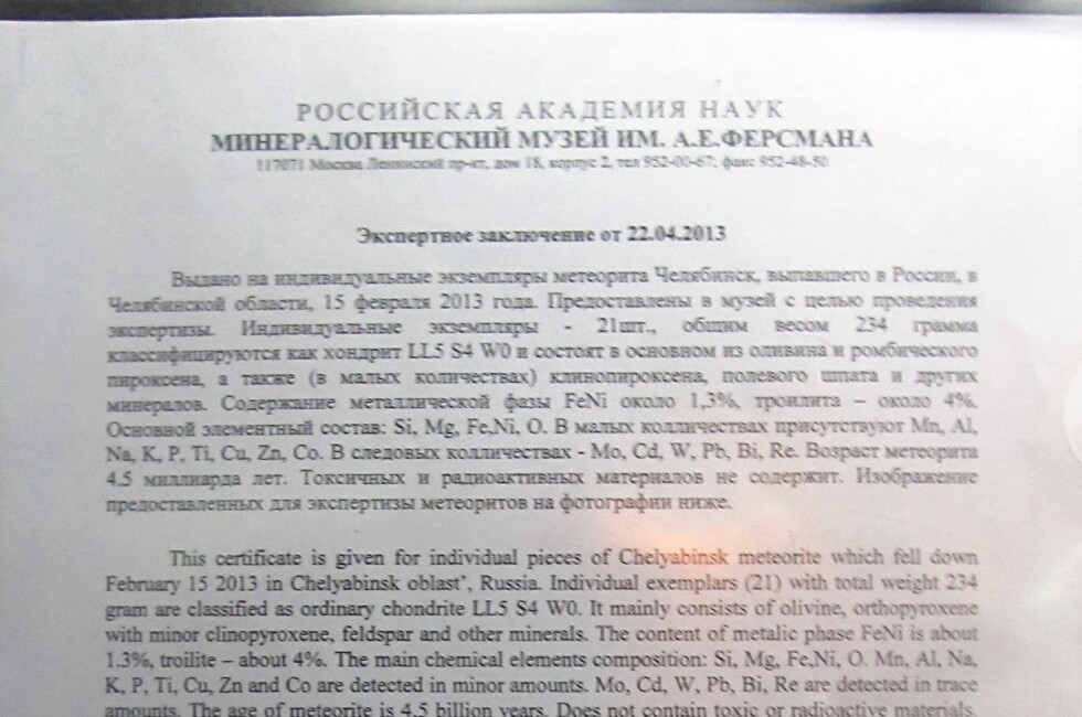 По ее словам, на футляре размещено также пояснение: «Индивидуальный экземпляр метеорита «Челябинск», выпавшего в России 15 февраля 2013 года» и размеры метеорита: 1,8х0,7х0,6 сантиметра».