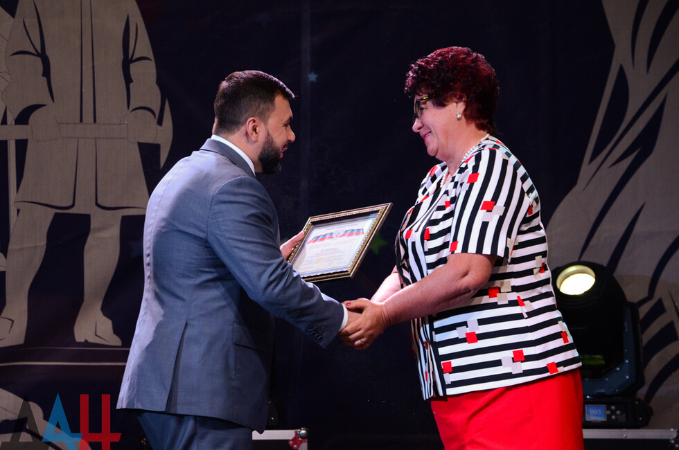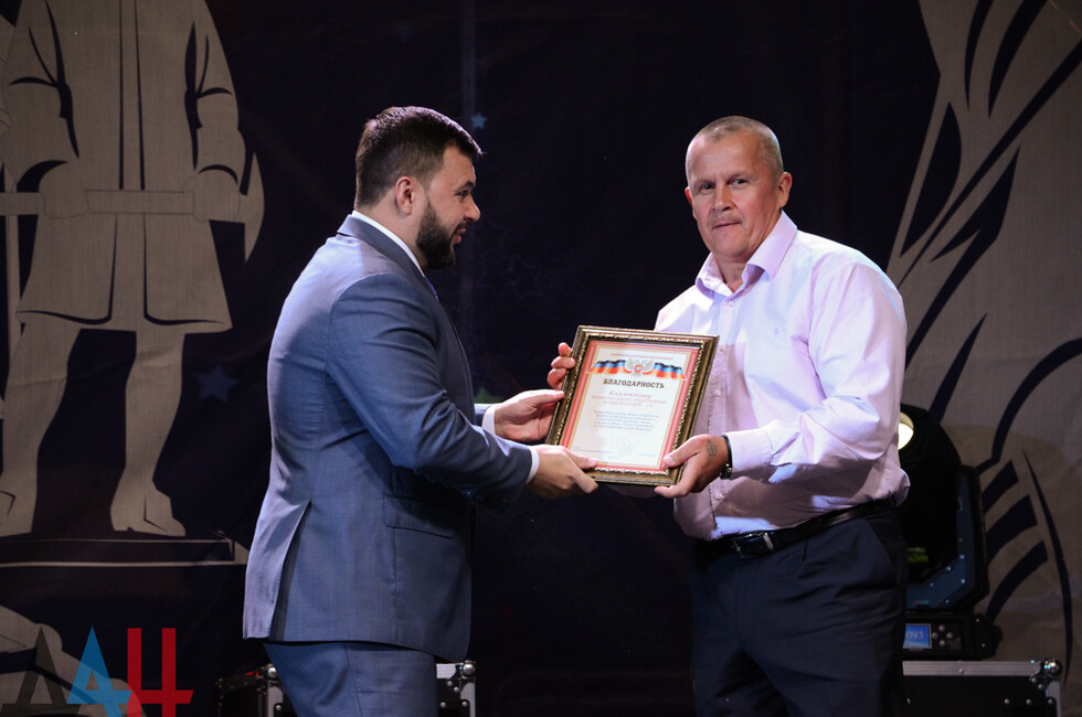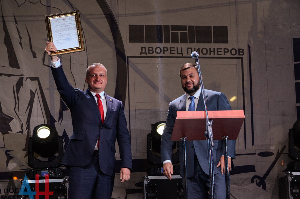 Он передал мэру Сергею Голощапову документ о присвоении Макеевке почетного звания «Город трудовой доблести». Затем Пушилин наградил троих сотрудников газеты «Макеевский рабочий» медалями за «Трудовую доблесть», также он посмертно наградил знаком отличия «Георгиевский крест» IV степени военнослужащего Народной милиции ДНР Дмитрия Рудова, награда была передана его родственникам. Кроме того, почетными грамотами и благодарностями были отмечены коммунальные предприятия города.