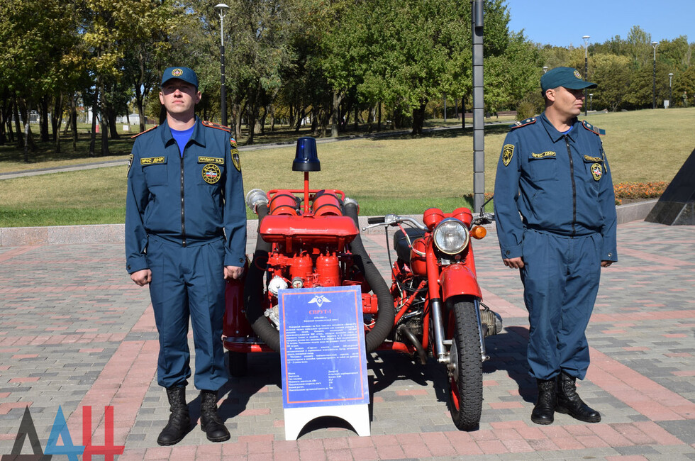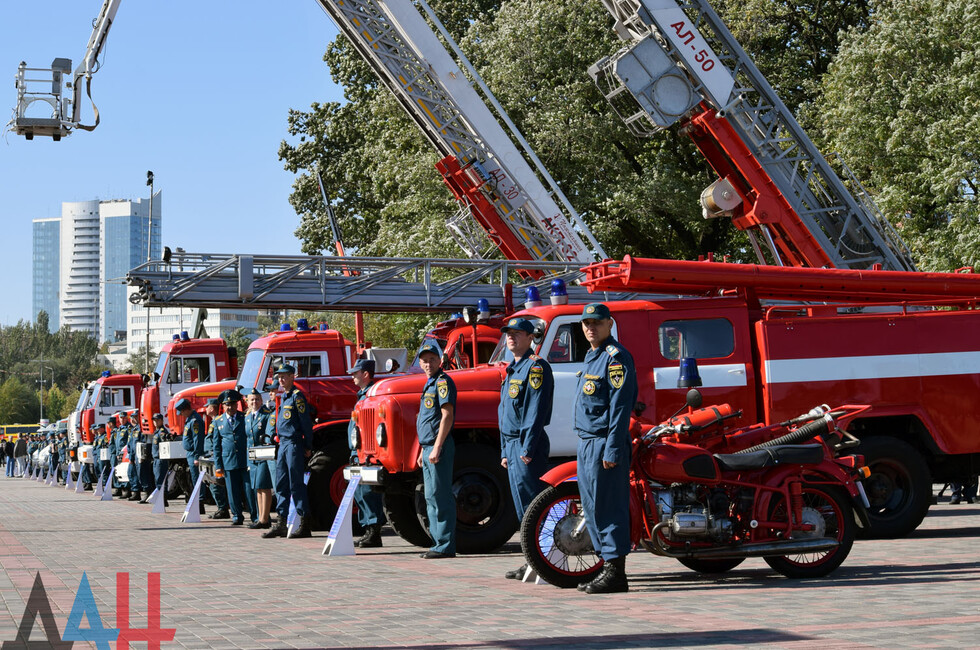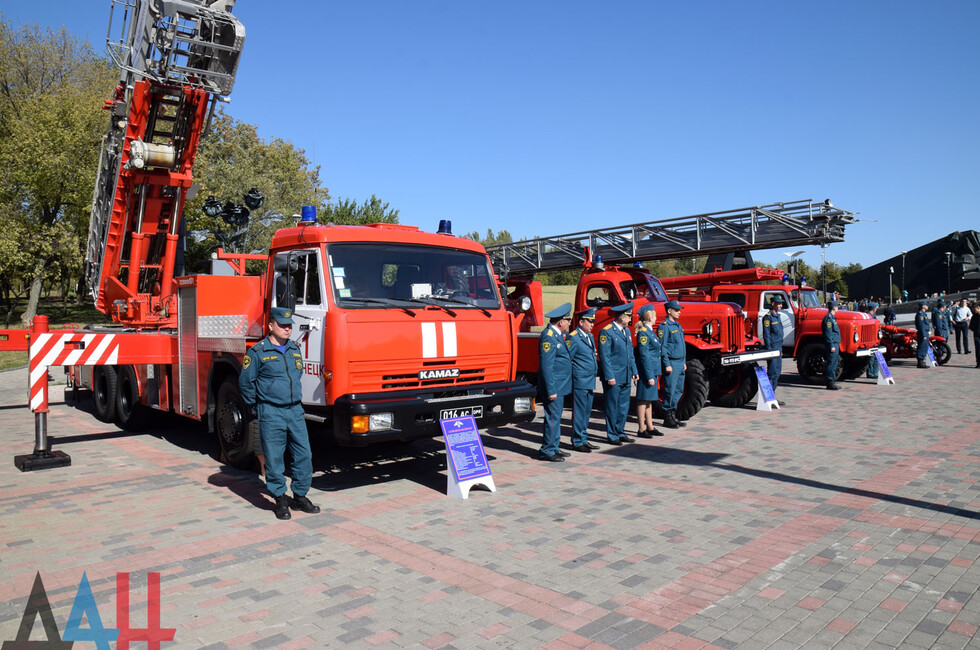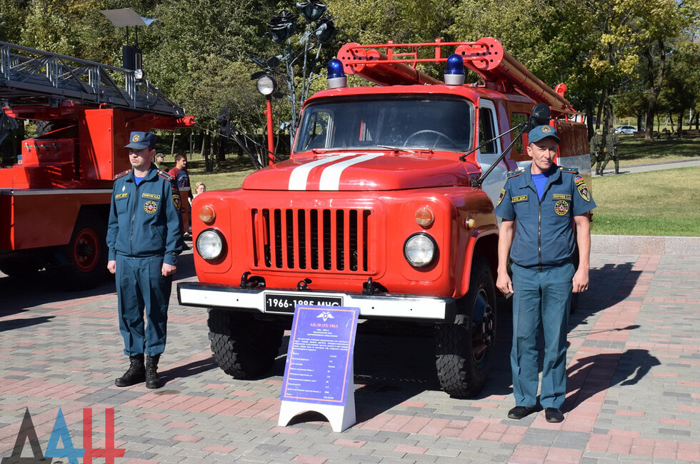 К празднику спасатели ДНР подготовили выставку спецтехники республиканского МЧС. Экспозиция включила больше десятка различных машин, в том числе современных и музейных: мотоцикл, автовышки, пожарные автоцистерны.