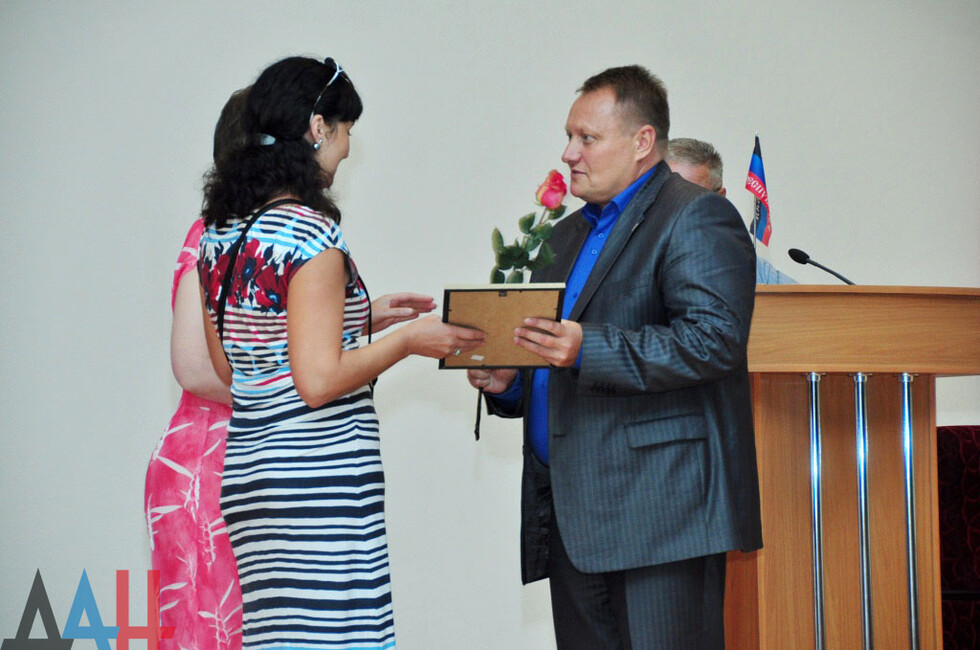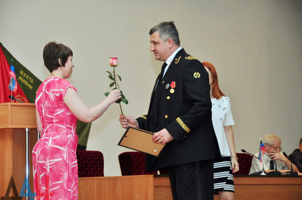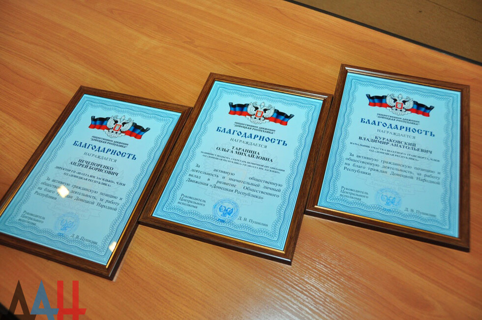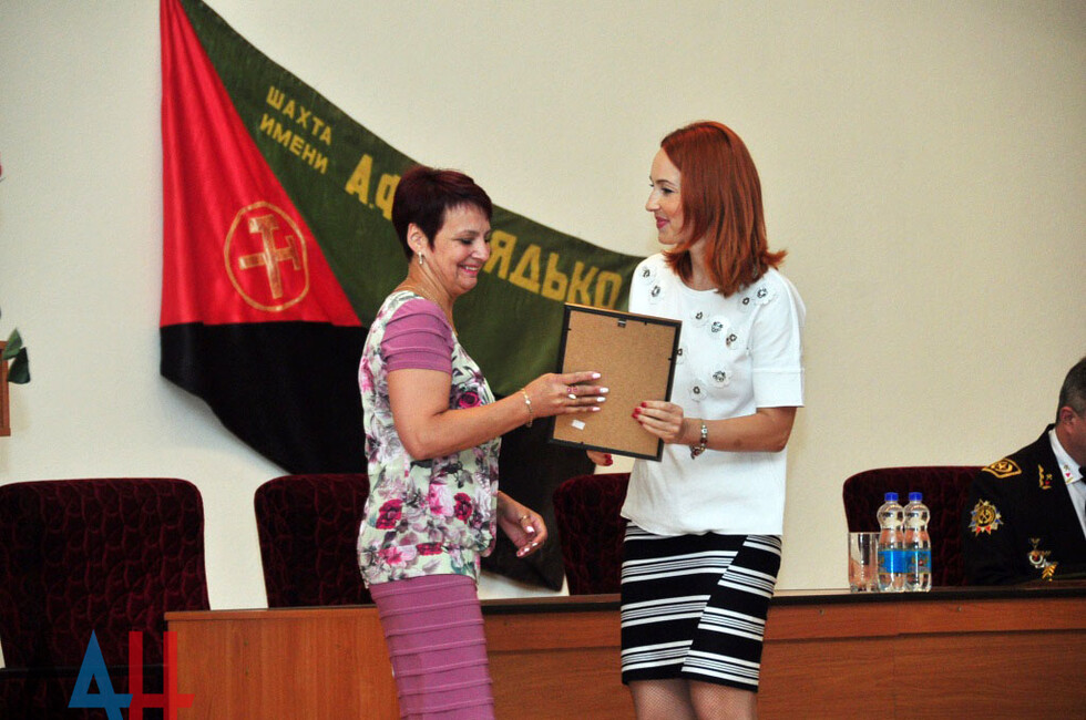 Она вручила три благодарности от Центрального исполкома общественного движения "Донецкая Республика" за активную общественную деятельность и значительный личный вклад в развитие движения. В числе награжденных и директор шахты.