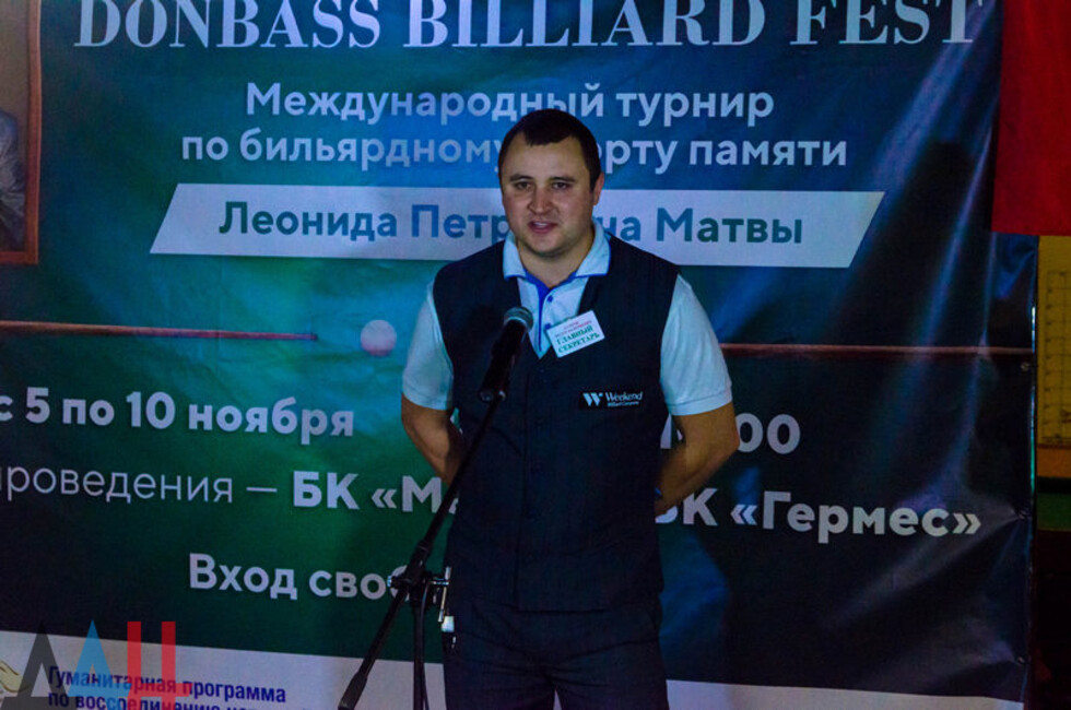 «Очень приятно видеть в этом замечательном зале такое созвездие спортсменов бильярдного спорта, представляющих страны, в которых хорошо развит этот вид спорта. Я приветствую всех участников и благодарю вас за то, что вы нашли возможность приехать в ДНР и своим присутствием украсить турнир, который посвящен памяти выдающегося мастера бильярдного спорта, который был в Донецке родоначальником бильярдного спорта <…> Леонида Петровича Матвы”, - сказал и.о. министра молодежи, спорта и туризма ДНР Александр Громаков.