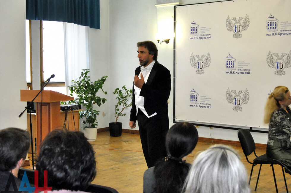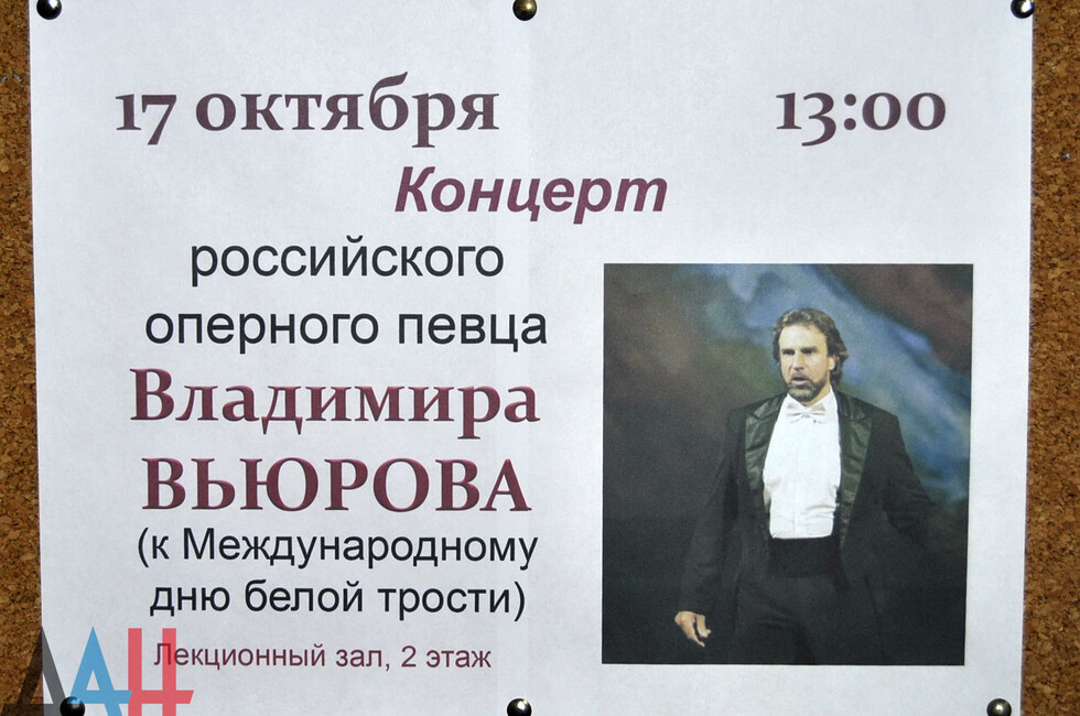 Донецк, 17 окт – корр. ДАН Известный оперный певец из Санкт-Петербурга Владимир Вьюров провел сегодня бесплатный концерт для слепых и слабовидящих в конференц-зале Донецкой республиканской универсальной научной библиотеки имени Н. К. Крупской. Благотворительное мероприятие было приурочено к Международному дню белой трости.