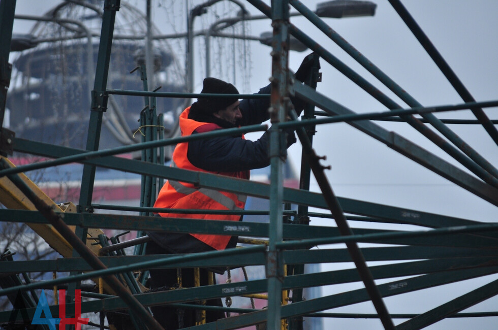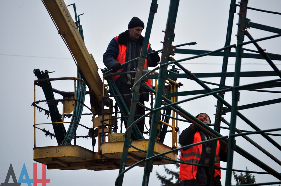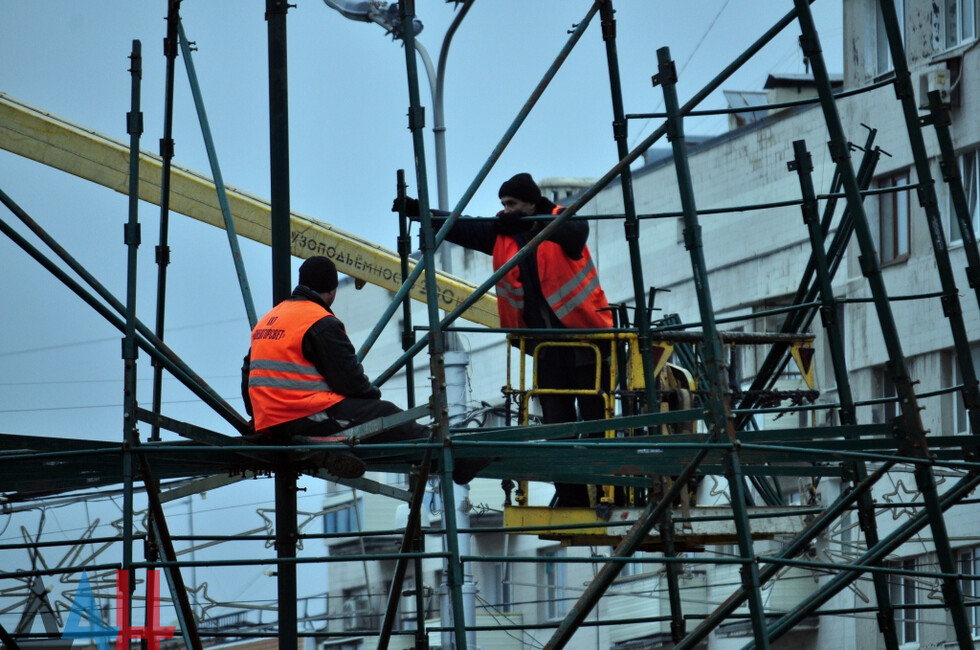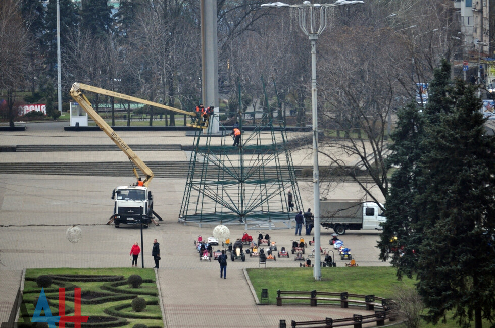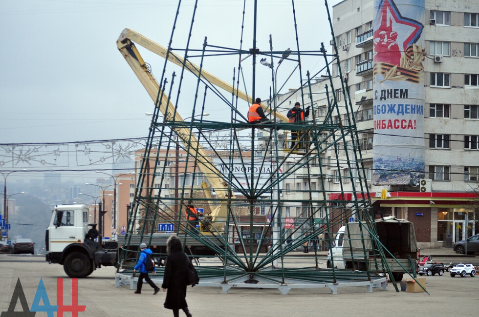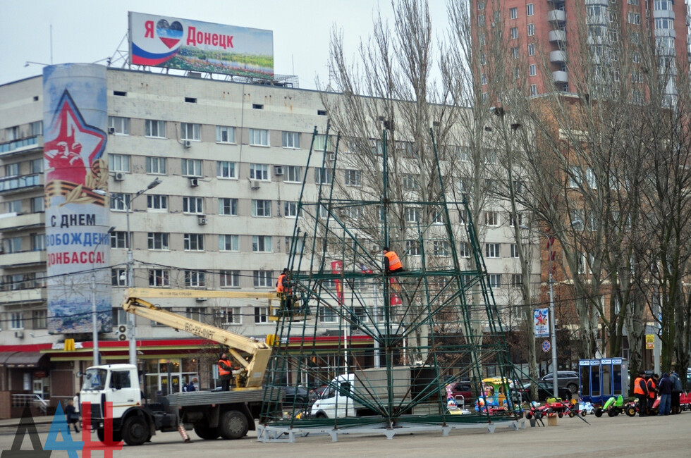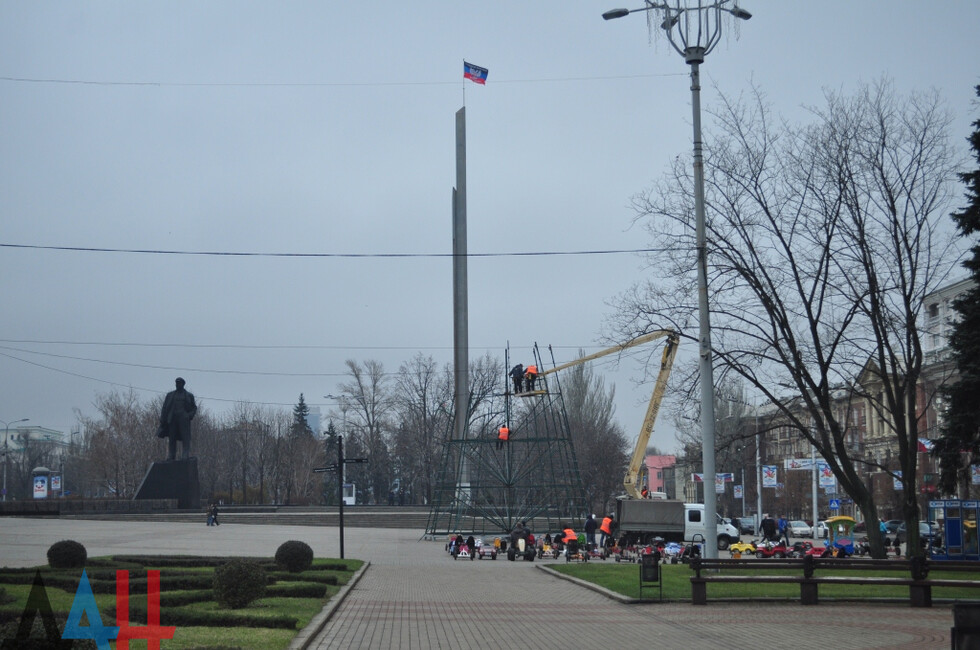 Донецк, 4 дек – ДАН. Работники коммунальных служб Донецка начали установку главной новогодней елки ДНР на площади имени Ленина в центре столицы, передает корр. ДАН с места события.