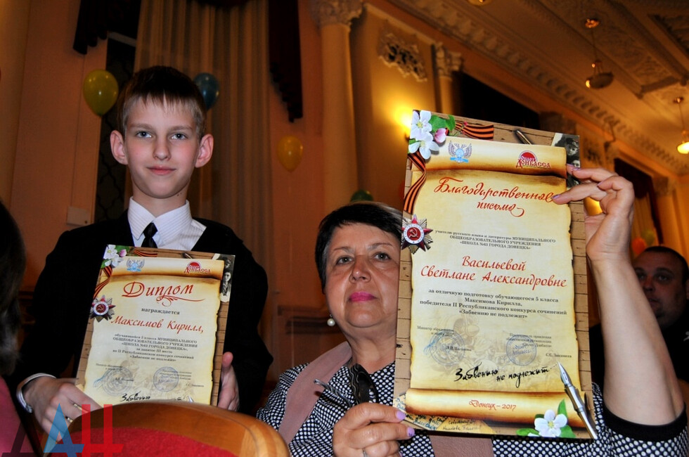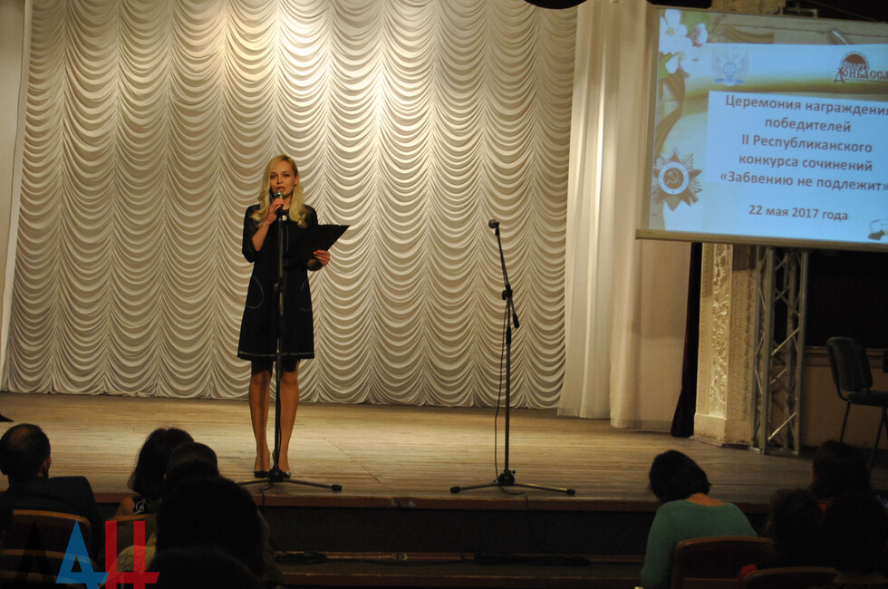 Донецк, 22 мая – ДАН. Конкурс сочинений среди школьников и студентов учреждений среднего профессионального образования ДНР «Забвению не подлежит» подвел сегодня свои итоги. Церемония награждения победителей прошла в здании Донецкого республиканского дворца детского и юношеского творчества.