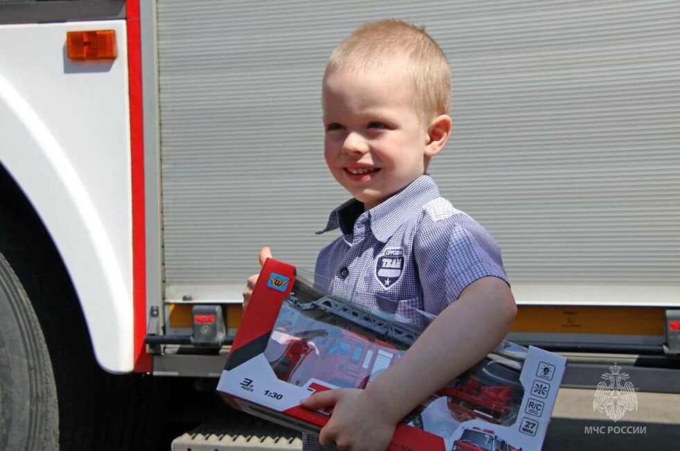 В завершении «рабочего» дня Ване вручили подарок — пожарную машину на пульте управления.