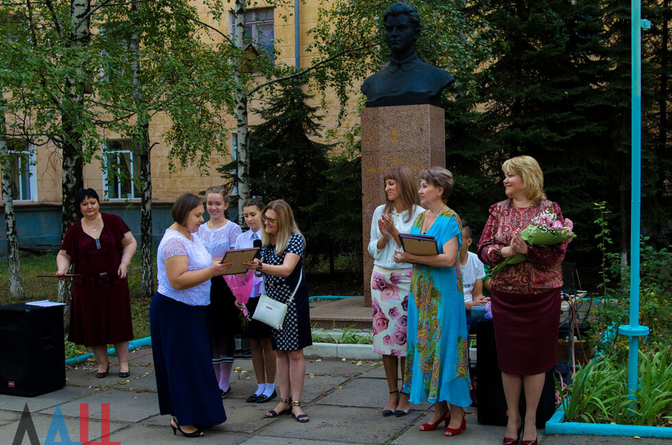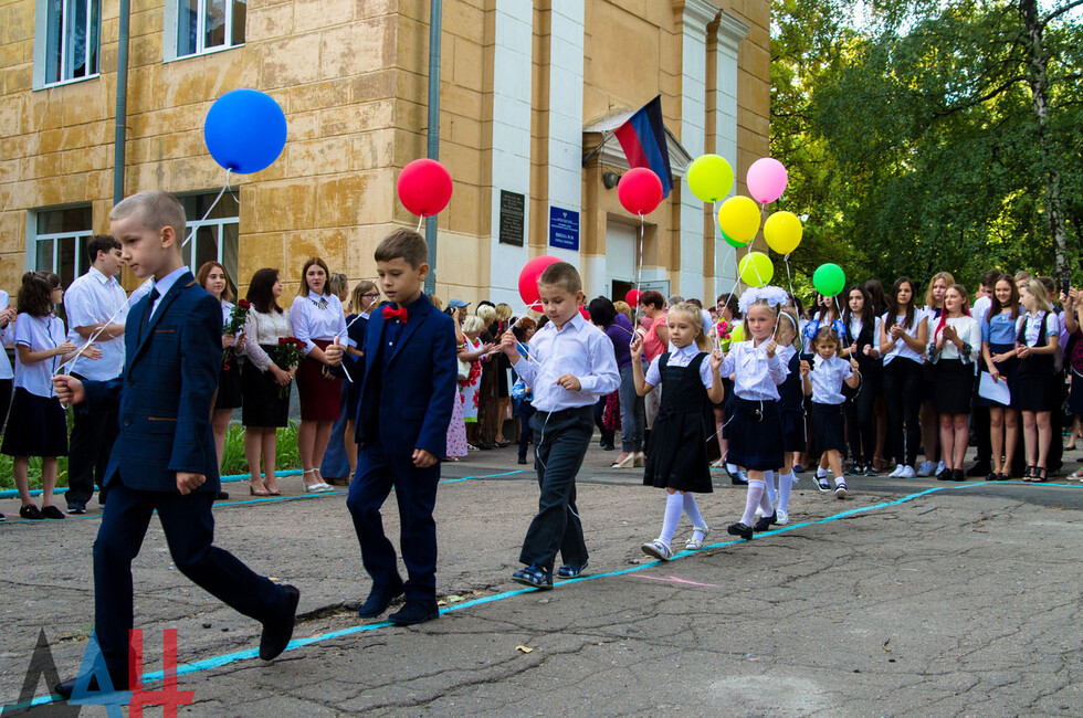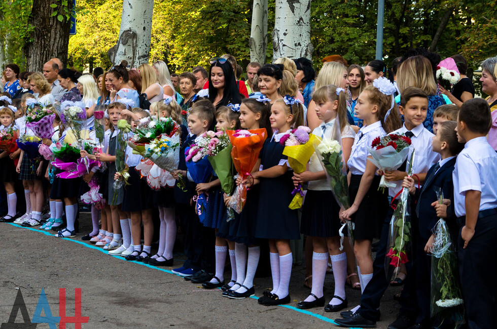 Торжественная линейка началась с минуты молчания по погибшему 31 августа Главе ДНР Александру Захарченко. В ходе мероприятия Макеева подарила школе флаг ДНР.