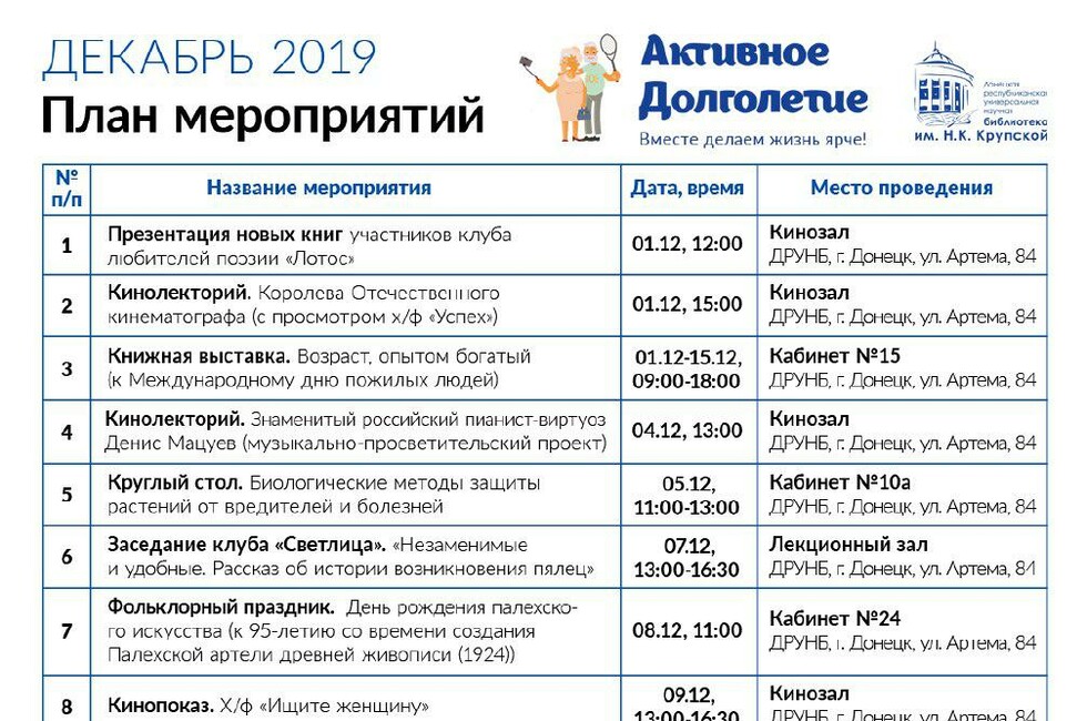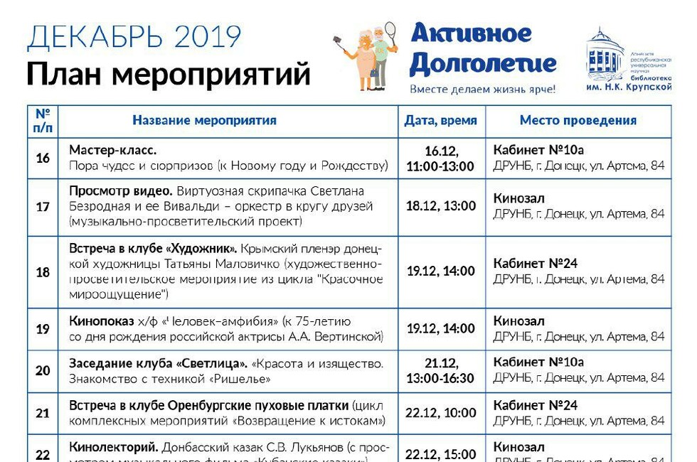 Донецк, 1 дек – ДАН. Порядка 100 пожилых людей посетили мероприятия проекта «Активное долголетие» в Донецкой республиканской универсальной научной библиотеке имени Крупской в первый день зимы. Об этом сегодня сообщили в пресс-службе учреждения.
