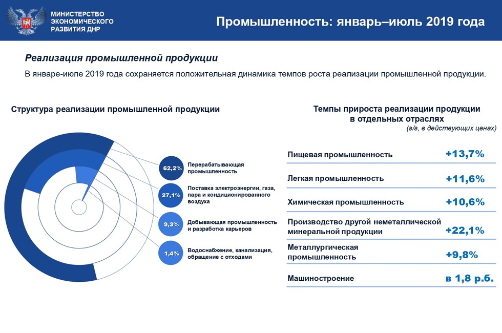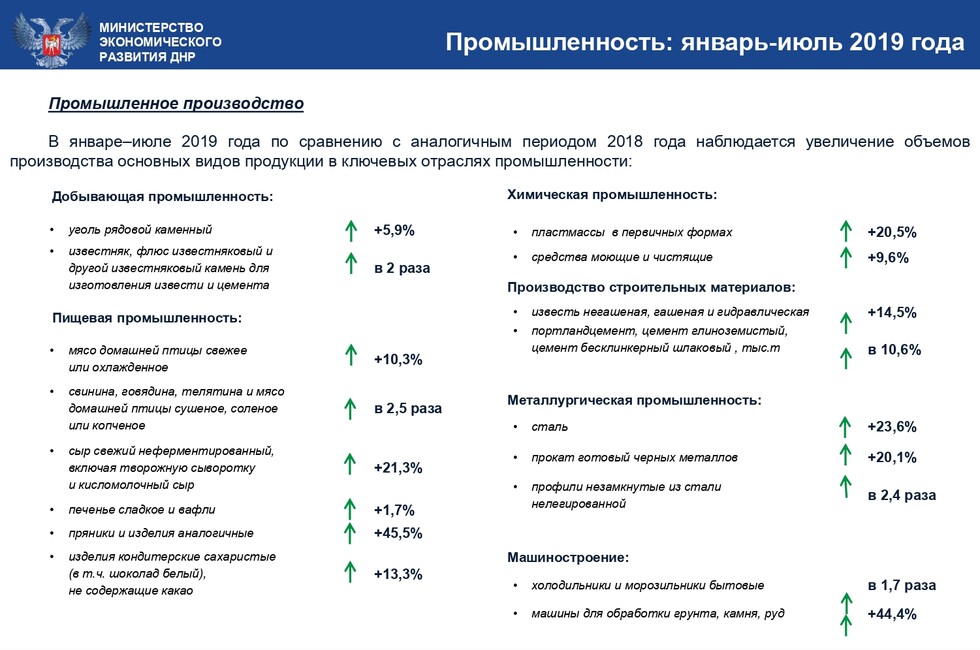Донецк, 13 сен – ДАН. Рост объемов производства продукции в ключевых отраслях промышленности ДНР по итогам первого полугодия текущего года составил от 1,7% до 150%. Об этом свидетельствуют данные министерства экономического развития Республики.