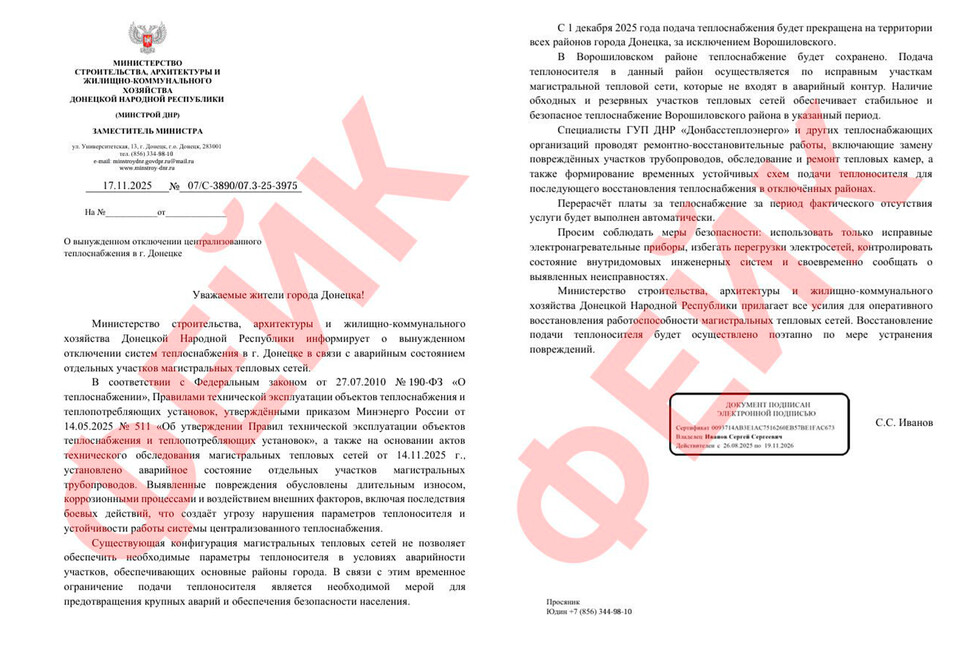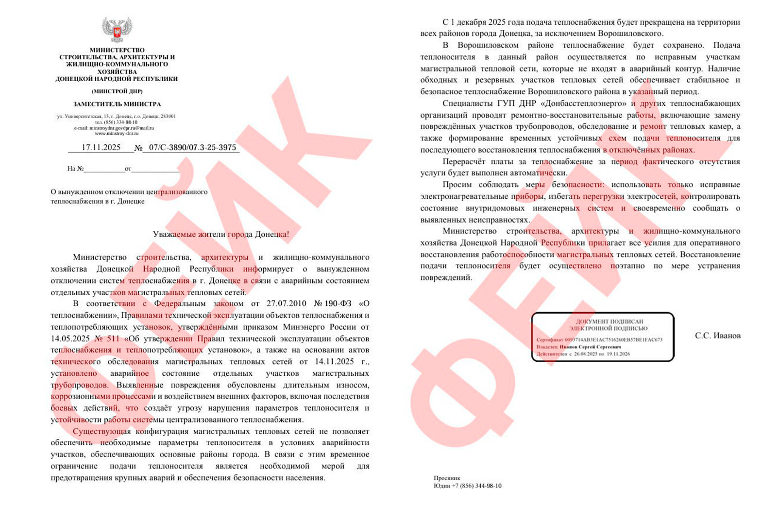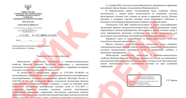 Отметим, что в социальных сетях появился документ якобы от имени Министерства строительства и жилищно-коммунального хозяйства ДНР, в котором сообщалось об отключении в Донецке отопления с 1 декабря из-за «изношенности систем ЖКХ». При этом в Ворошиловском районе города оно бы осталось.