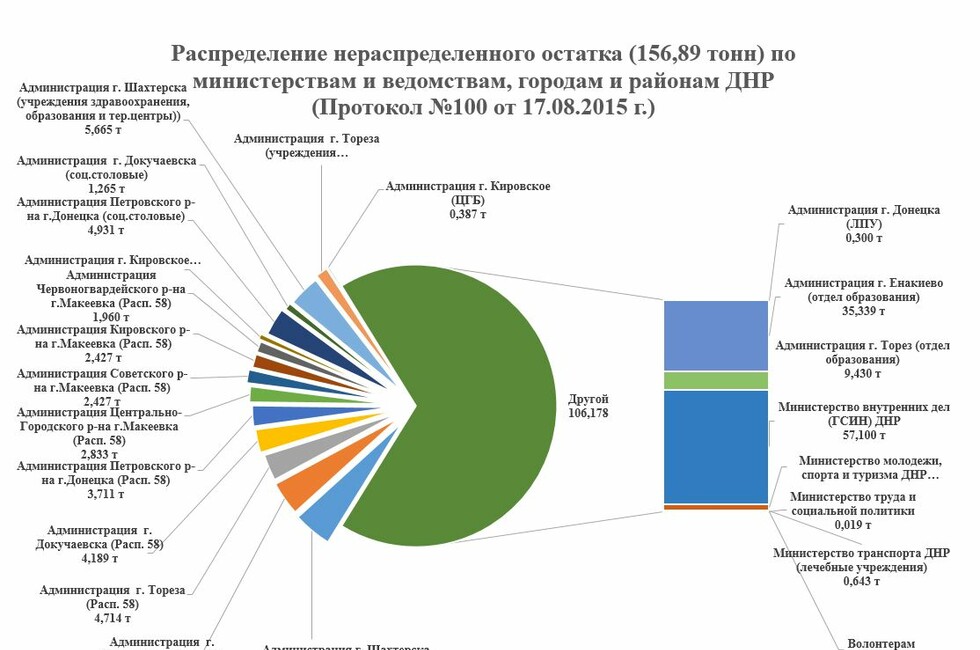 «Порядка 70 тонн груза из гумконвоя было распределено Минздраву ДНР, - сказали в ЦУВ. – Еще 156 тонн груза было распределено в города и районы Республики, а также другим министерствам. В резерв главы было направлено порядка 56 тонн груза. Остальной груз пока не распределен».