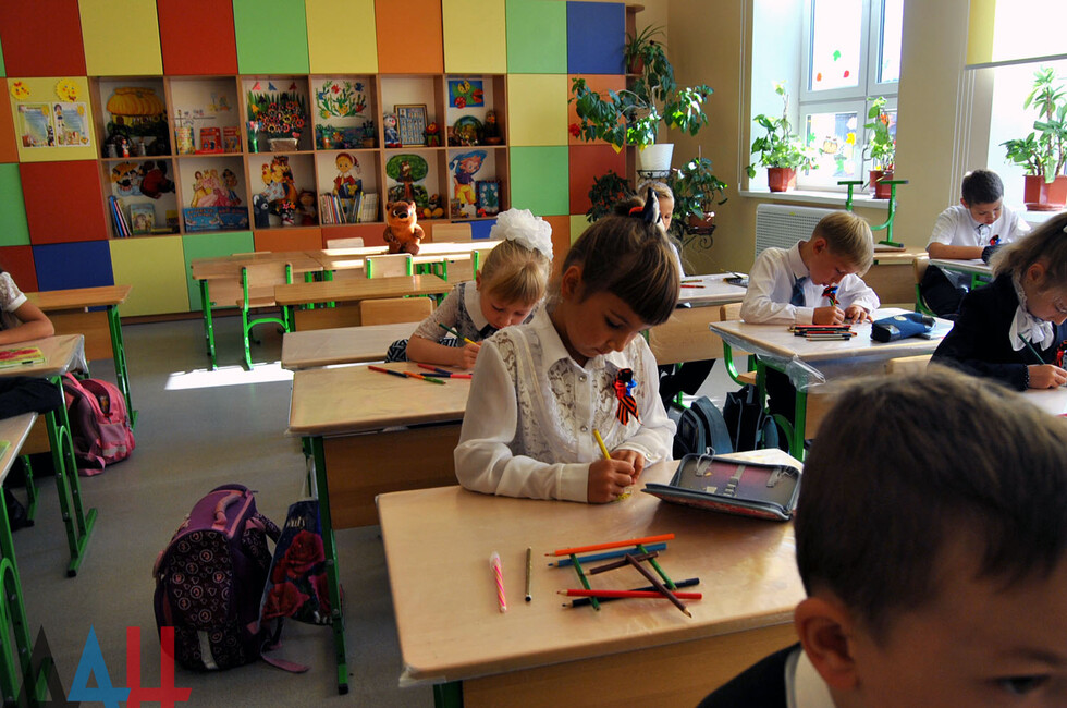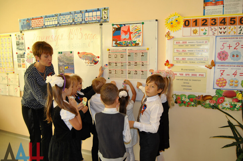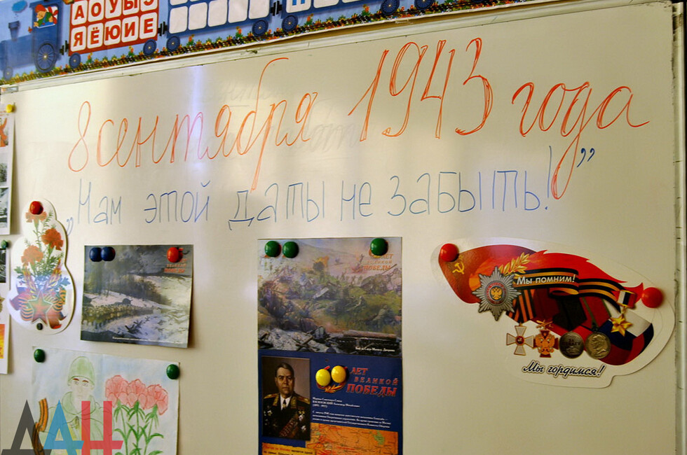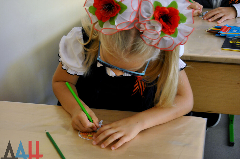 Следом в школе начался единый урок «Мы помним», в рамках которого ребята вспоминали подвиги героических предков. Программа в каждом классе была своя. К примеру, во 2-м "А" школьники раскрасили каждый по цветку и возложили их к доске памяти Героев Советского Союза, освобождавших Донбасс. По окончании урока учебный процесс продолжился в штатном режиме. *нс*мк