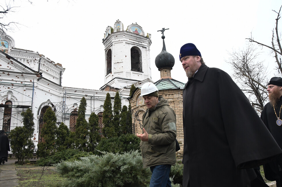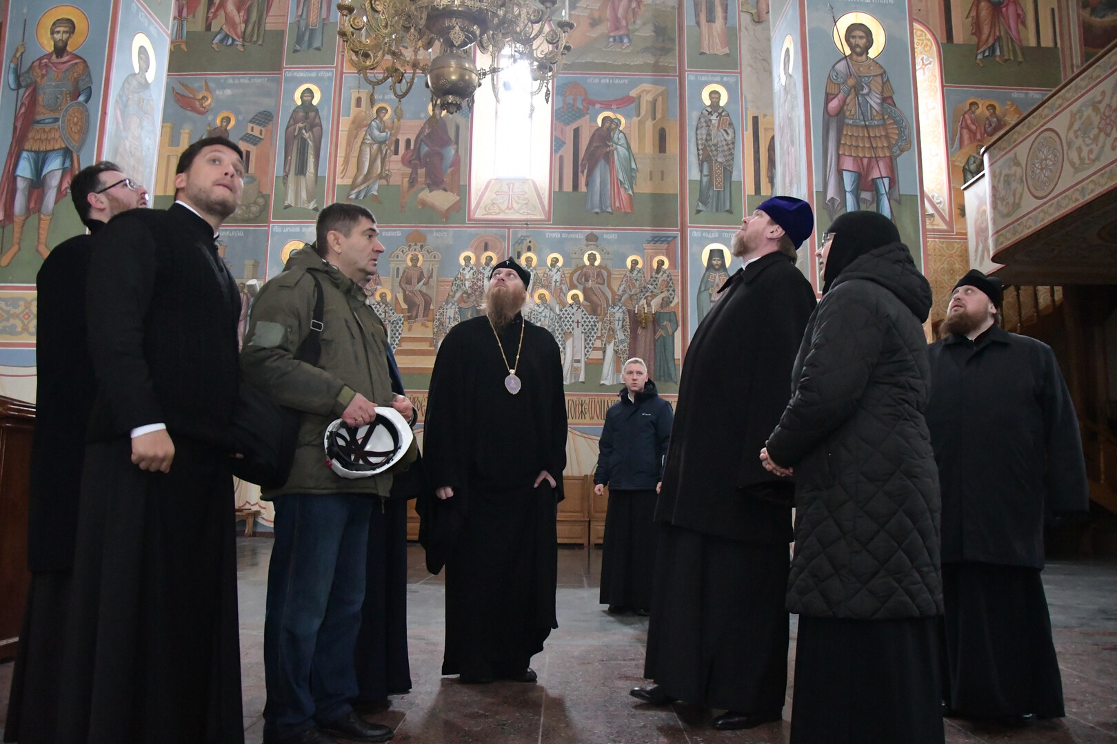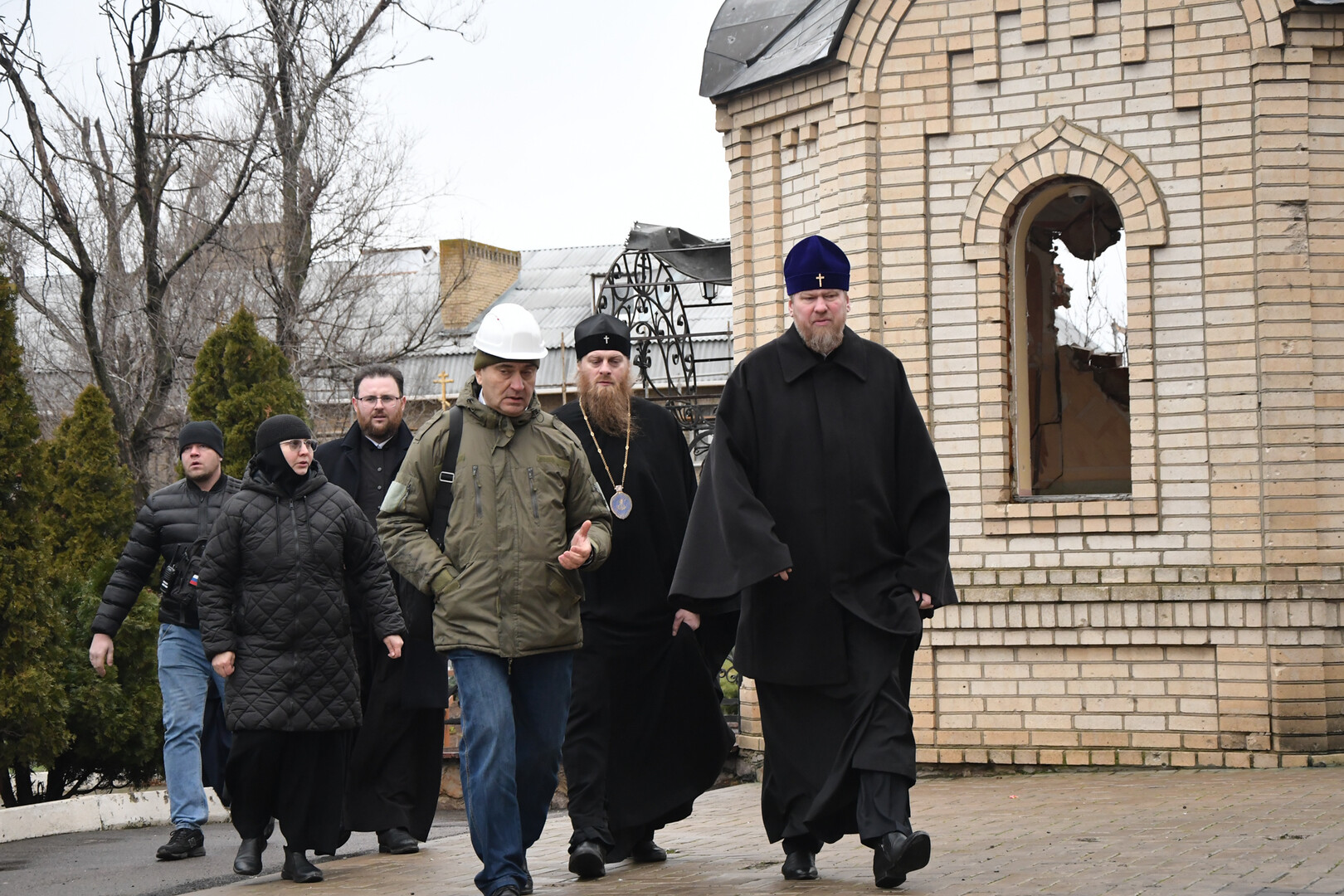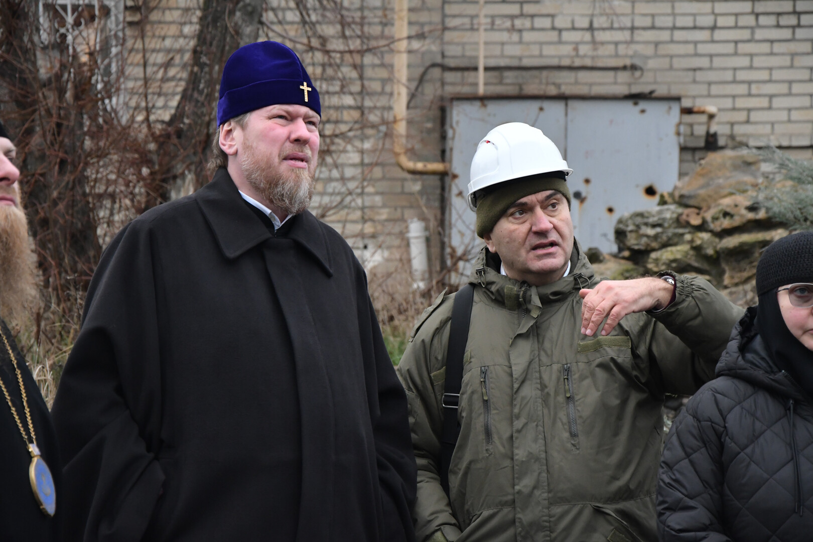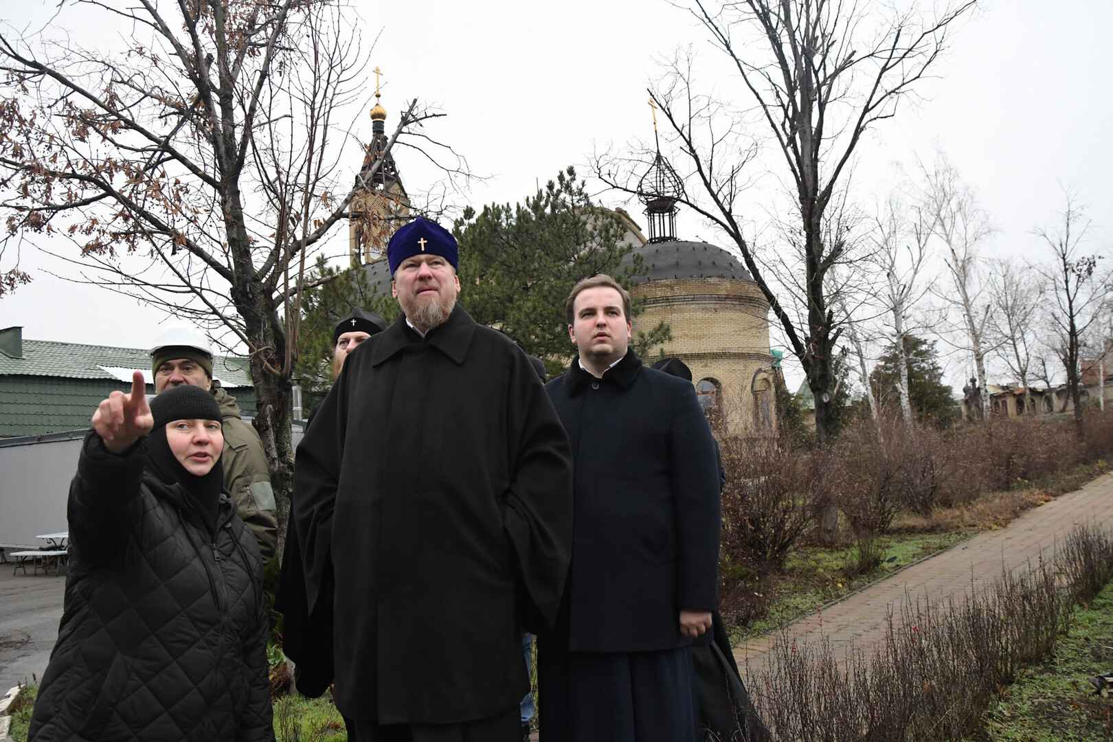 По окончании Божественной литургии в нижнем храме собора митрополит Владимир в сопровождении наместника мужского монастыря архиепископа Волновахского Амвросия и настоятельницы женской обители игумении Анны (Морозовой) детально ознакомился с ходом ремонтно-восстановительных работ. Были осмотрены храмовые комплексы, уделено особое внимание восстановлению фасадов, поврежденных взрывными волнами, и монтажу современной системы отопления, что является ключевым вопросом для жизнеобеспечения общин в зимний период.