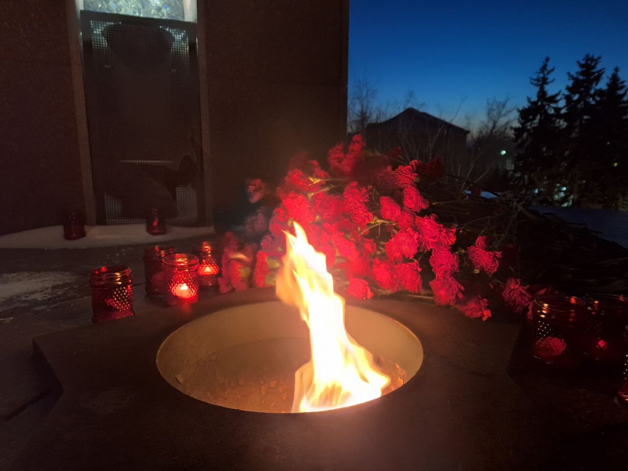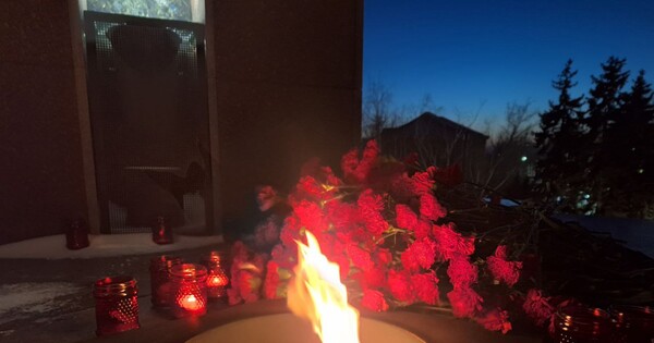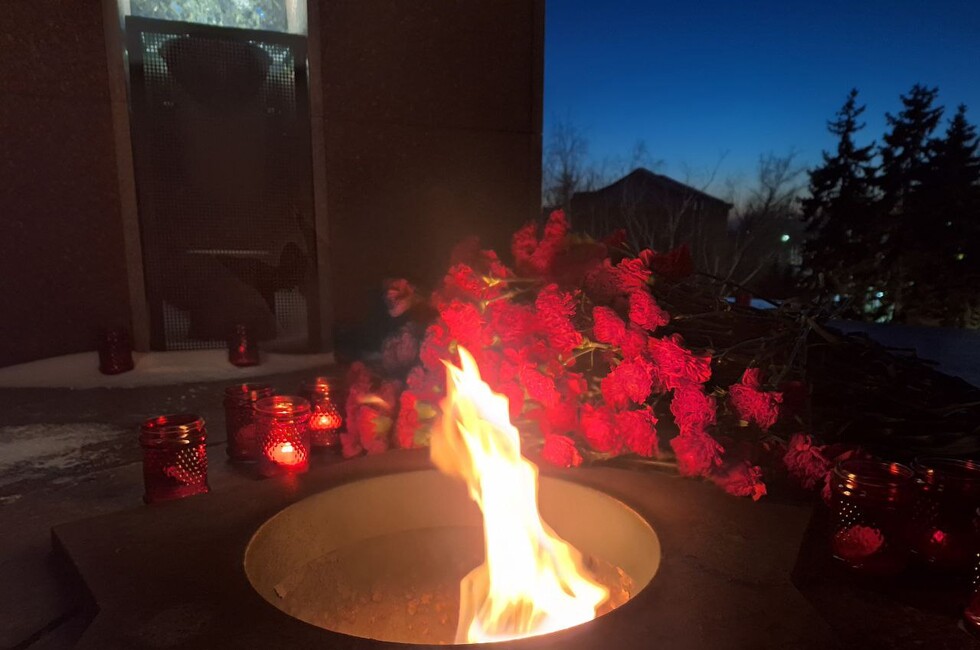 Участники акции зажгли красные лампадки, выложив ими путь к Вечному огню и площадку на вершине мемориала. Под песню «В землянке» они возложили цветы к Вечному огню в память о погибших красноармейцах.