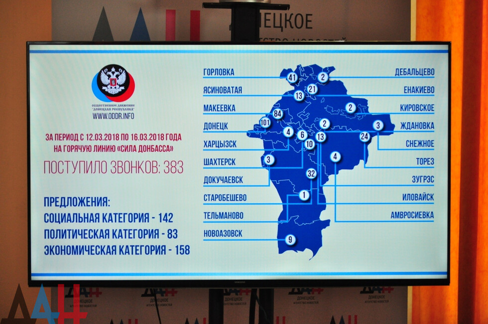 «По поручению председателя нашего общественного движения, Главы ДНР Александра Захарченко продолжается обсуждение стратегии развития Республики «Сила Донбасса». На 20 марта 2018 года в колл-центр поступило 383 звонка», – отметила Волкова.