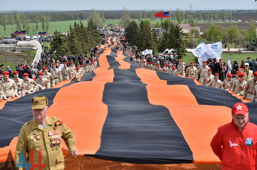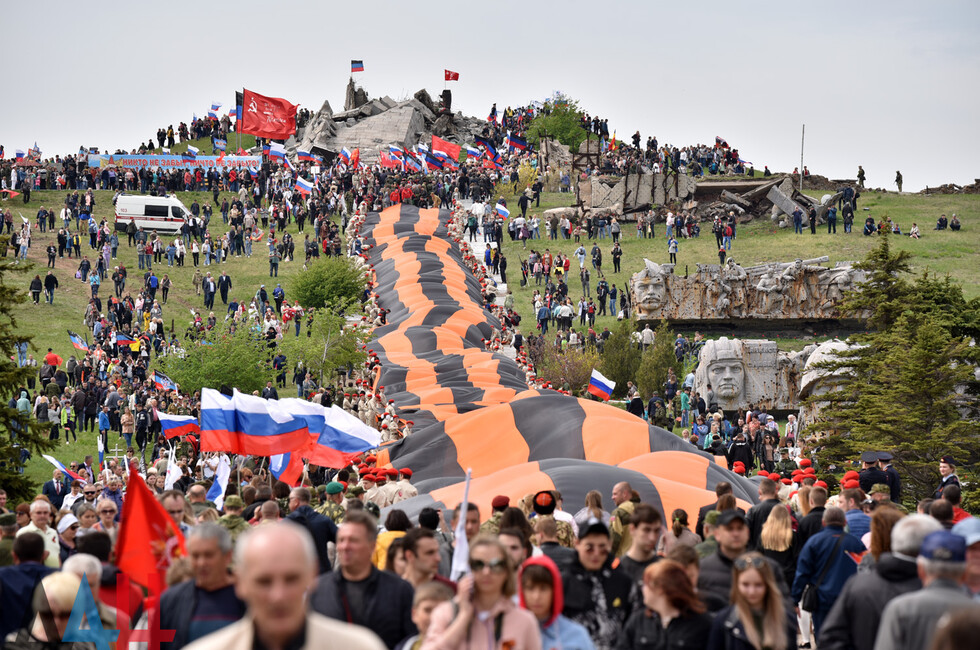 Саур-Могила (Шахтерский район), 8 мая - корр. ДАН. Георгиевская лента длиной 300 метров была развернута на мемориальном комплексе «Саур-Могила», где сегодня проходят торжества к предстоящей 76-й годовщине Победы в Великой Отечественной войне. Об этом сообщает корр. ДАН с места событий.