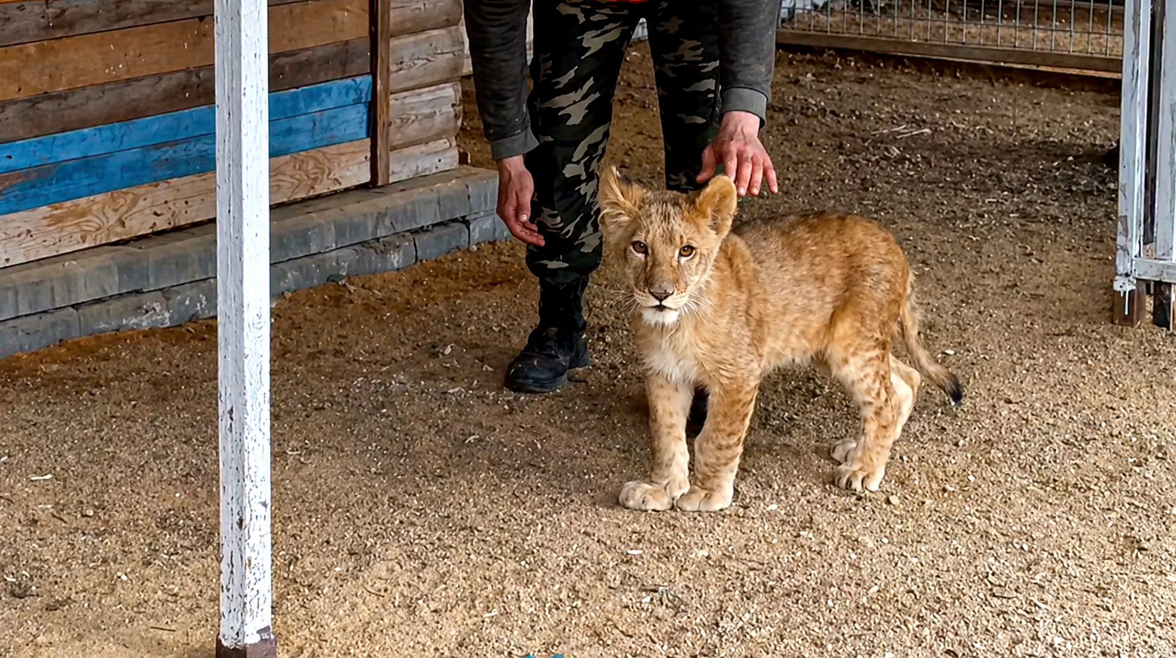 У львенка травмированы лапы, ветеринар прописал ему прогулки. Поэтому его регулярно выводят из вольера пройтись. Животное отличается хорошим аппетитом. Его кормят говядиной, курицей и хрящами, которые очень полезны в этом возрасте.