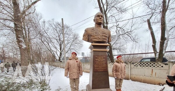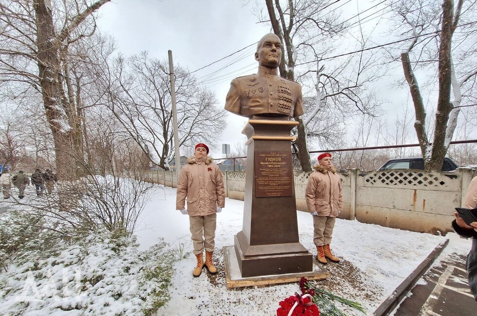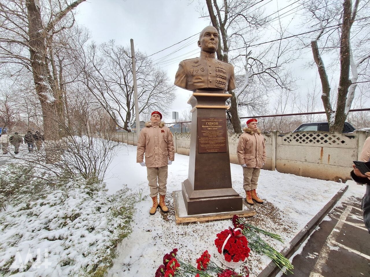 Донецк, 27 дек — корр. ДАН. Мемориальную доску и памятник в честь родившегося в Украинске первого дважды Героя России генерал-майора Михаила Гудкова открыли в донецкой школе №104. Об этом передает корреспондент Донецкого агентства новостей с места события.