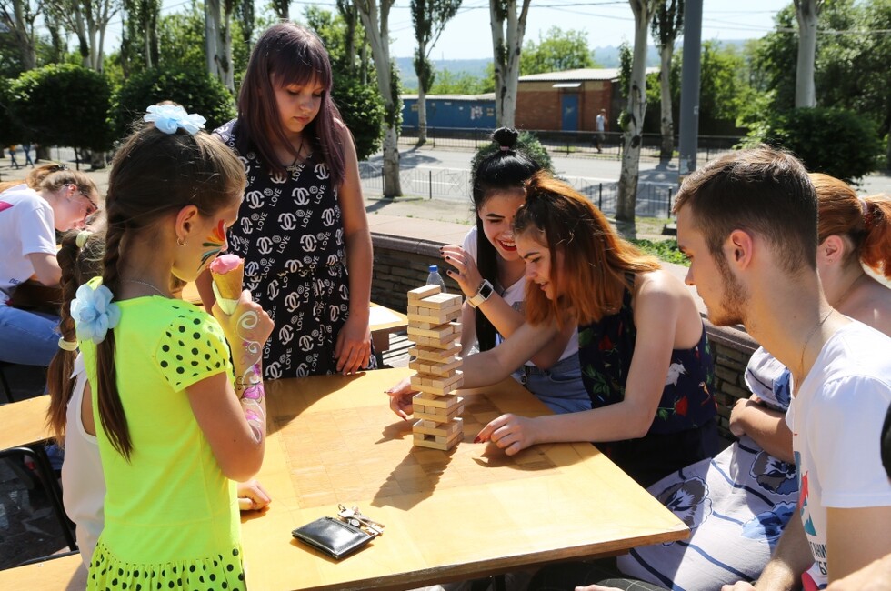 В общественном движении добавили, что мероприятия прошли у городского дворца детского и юношеского творчества имени Джарты. Здесь выступили детские творческие коллективы, а на прилегающих к учреждению территориях были развернуты игровые и творческие площадки, также находились лотки с лакомствами. Далее в зале дворца прошел творческий фестиваль «Дети земли Донбасской». В концертной программе выступили воспитанники дошкольных учреждений.