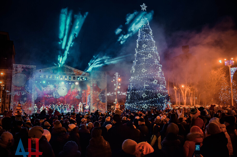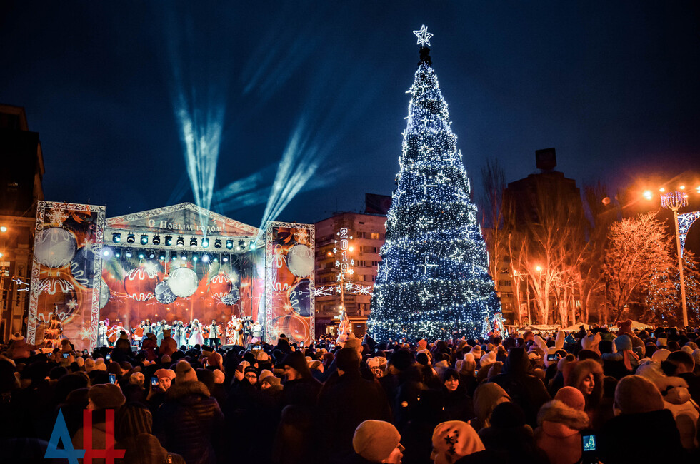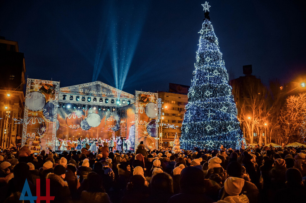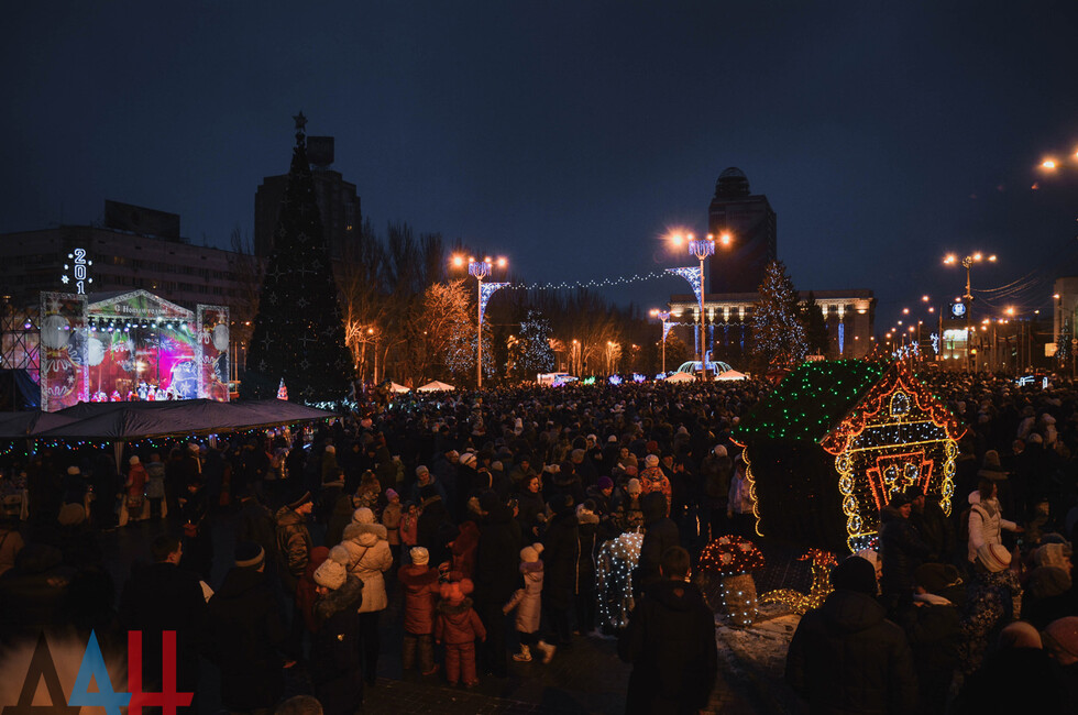 Несмотря на мороз, праздничные гулянья собрали несколько тысяч жителей и гостей столицы. Церемонию сопровождают театрализованное шоу и веселые конкурсы. На концерте под открытым небом блистают талантами лучшие творческие коллективы Республики. Дед Мороз и Снегурочка – артисты донецких театров – поздравляют собравшихся на площади горожан с наступающим Новым годом.