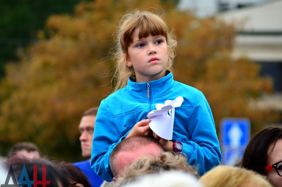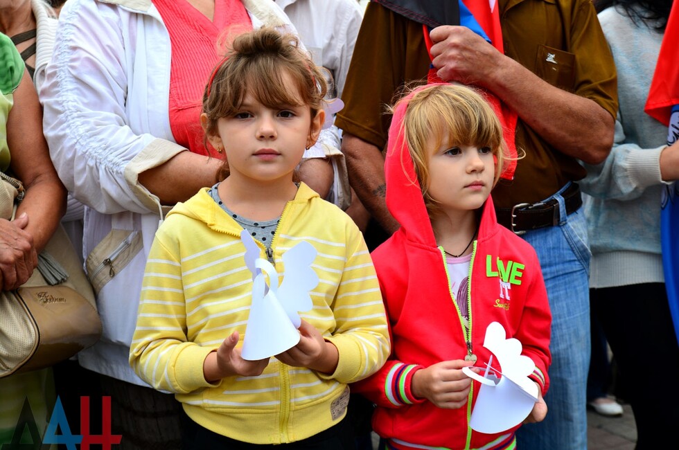 Донецк, 31 авг – корр. ДАН. Около тысячи человек собрались сегодня в Донецке, чтобы почтить память погибших в ходе конфликта детей из Донецкой Народной Республики. Митинг «Они не услышат последний звонок» прошел на центральной площади города.
