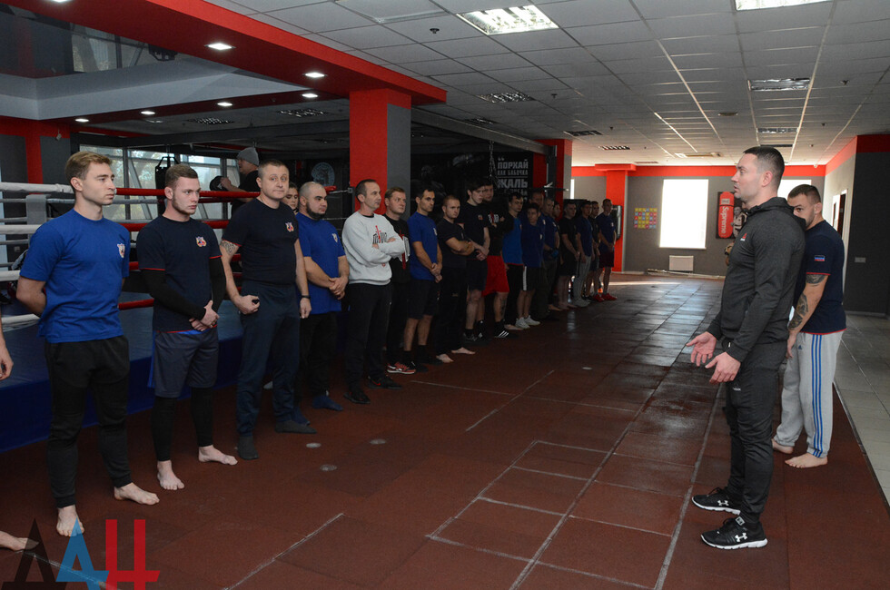 Занятия начались с разминки - бега и прыжков на месте. Затем участники поделились на две группы: одни отрабатывали навыки боксерского боя, а другие изучали борцовские приемы – захваты, броски и прочее. Мероприятие продолжалось более часа.