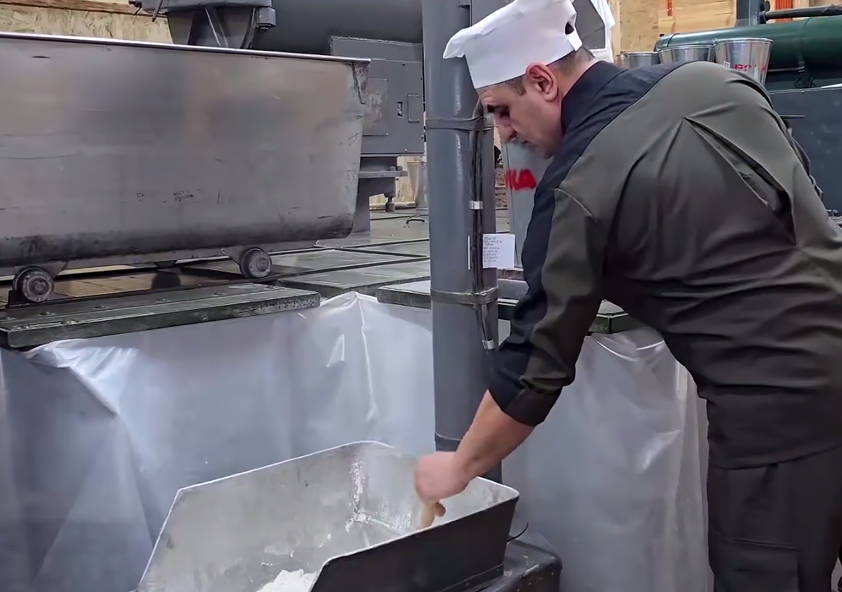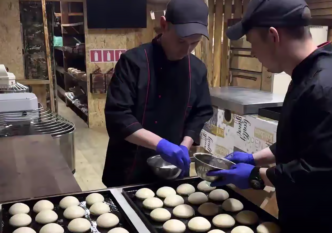Технология: Чтобы приготовить 2,5 тыс. буханок хлеба ежедневно, используют следующий рецепт: на каждые 100 кг муки добавляется примерно 0,5 кг дрожжей и около 70–80 литров воды. Процесс начинается с подготовки опары, добавления необходимых компонентов и тщательного перемешивания. Затем тесто разделяется на порции и отправляется в шкаф для отдыха. Завершающим этапом является помещение заготовленных изделий в духовку, где они запекаются примерно за 40–45 минут.