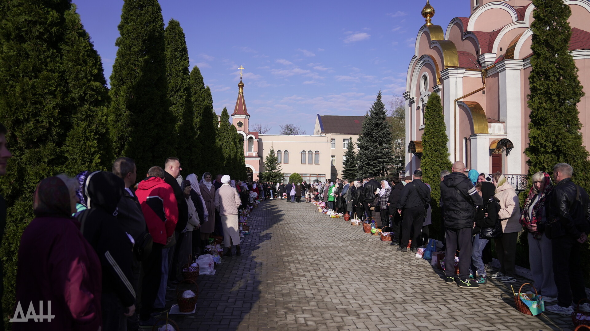 В храме провели традиционную пасхальную службу, после чего люди выстроились с корзинами, наполненными пасхальными угощениями для обряда окропления святой водой.