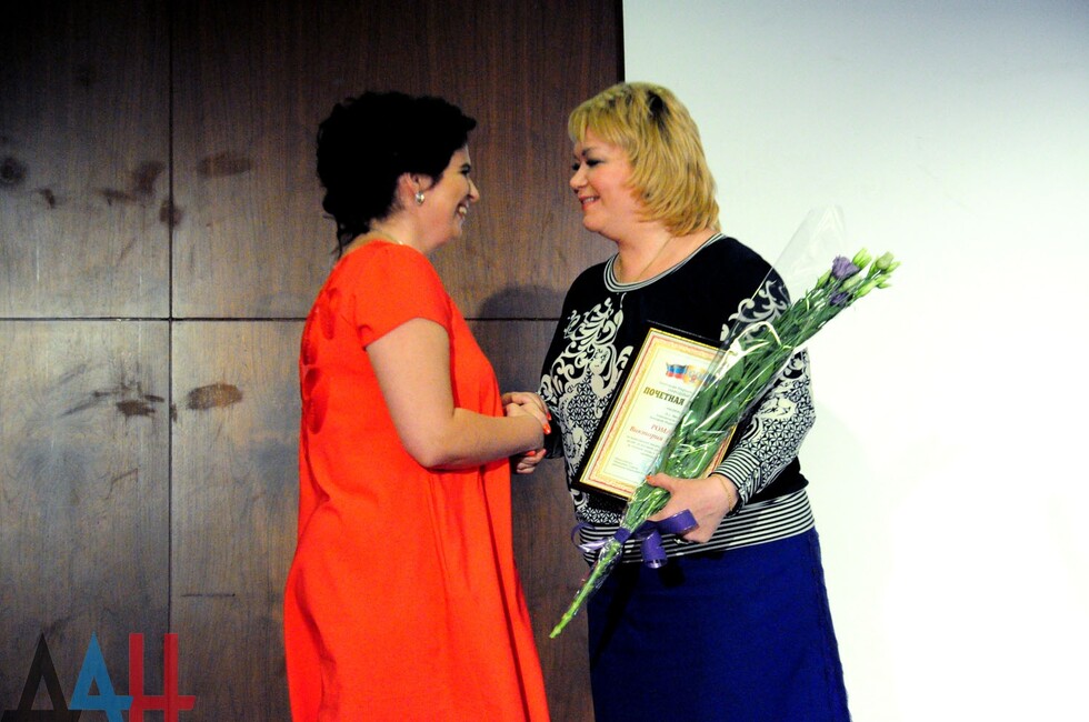 Затем Макеева лично поздравила с профессиональным праздником министра экономического развития ДНР Викторию Романюк и вручила ей почетную грамоту.