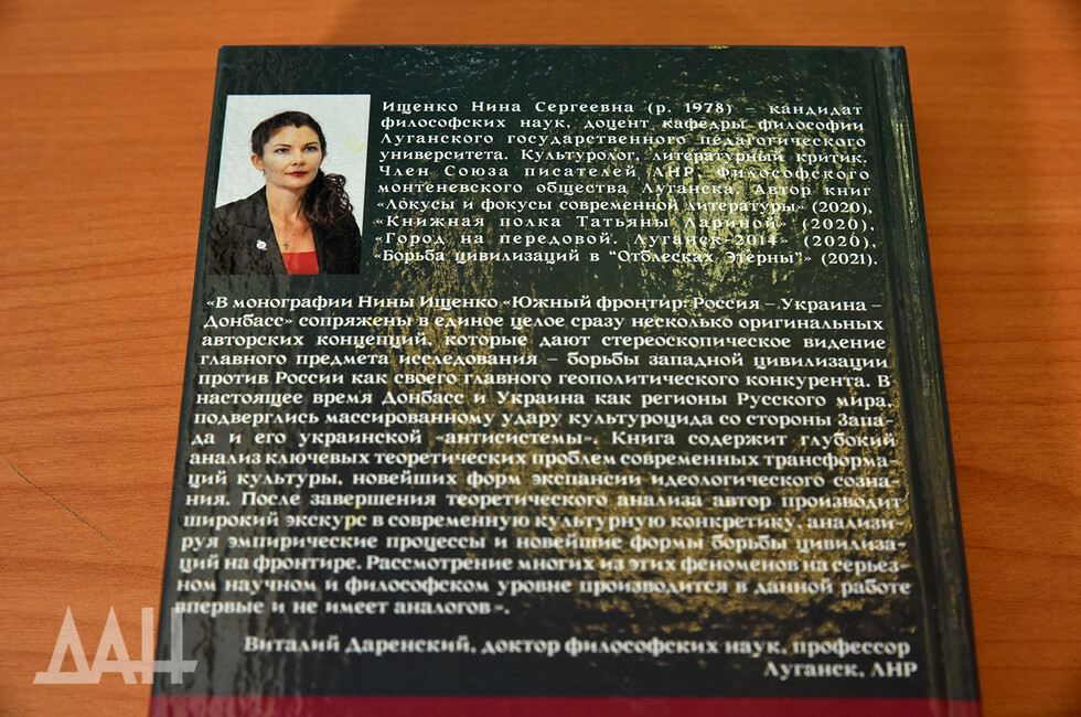 Донецк, 21 янв – ДАН. Механизмы культурного противостояния двух крупных цивилизаций и место в нем шахтерского региона раскрываются в книге «Южный фронтир: Россия – Украина – Донбасс», изданной в ЛНР. Об этом сегодня на брифинге в ДАН заявила автор книги, культуролог, кандидат философских наук, доцент кафедры философии Луганского государственного педагогического университета, член Союза писателей ЛНР Нина Ищенко.